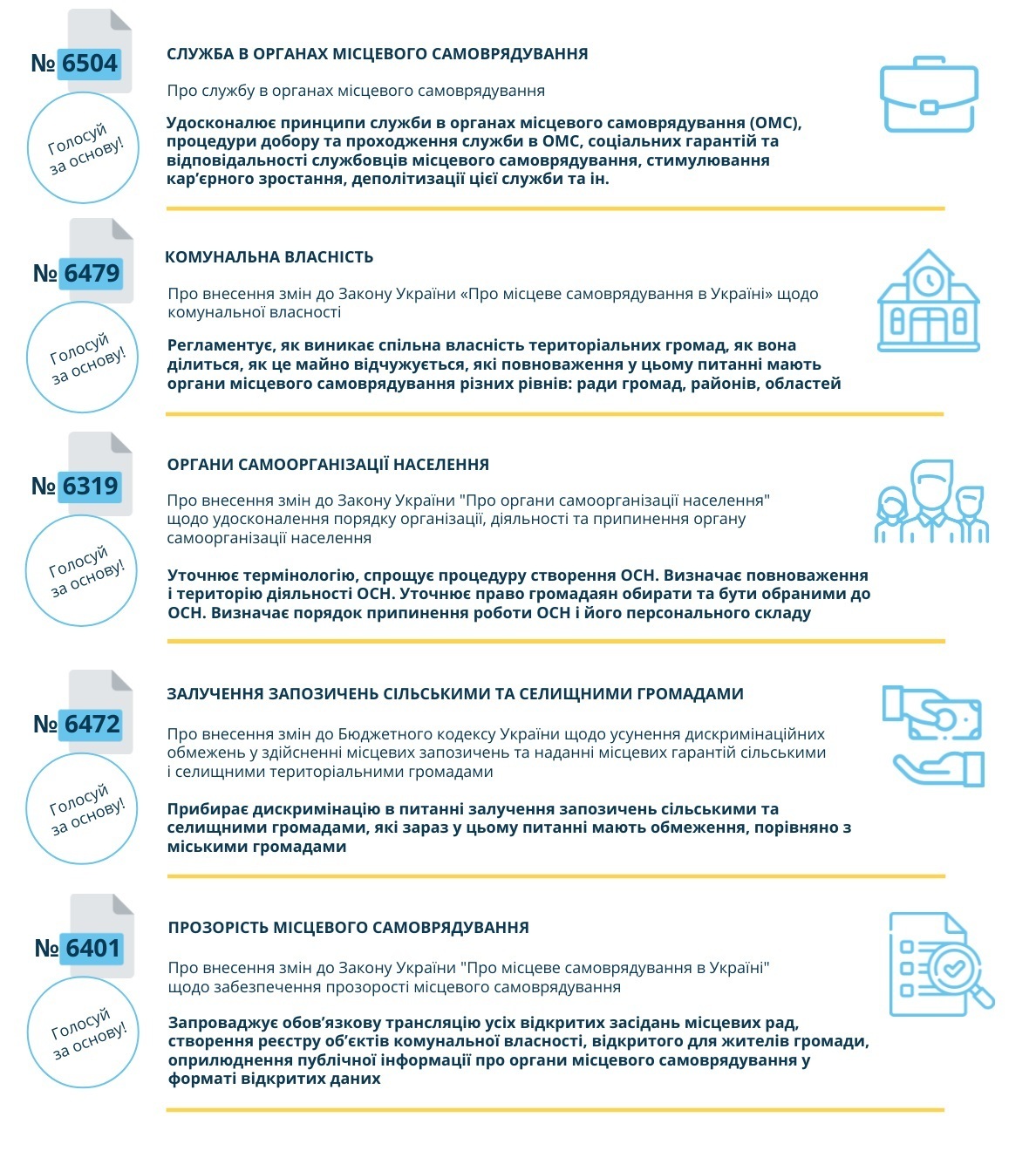 Найбільш актуальні для місцевого самоврядування законопроєкти, що вже зареєстровані в Парламенті, ми традиційно зібрали у один список і надалі слідкуватимемо за їхнім розглядом.