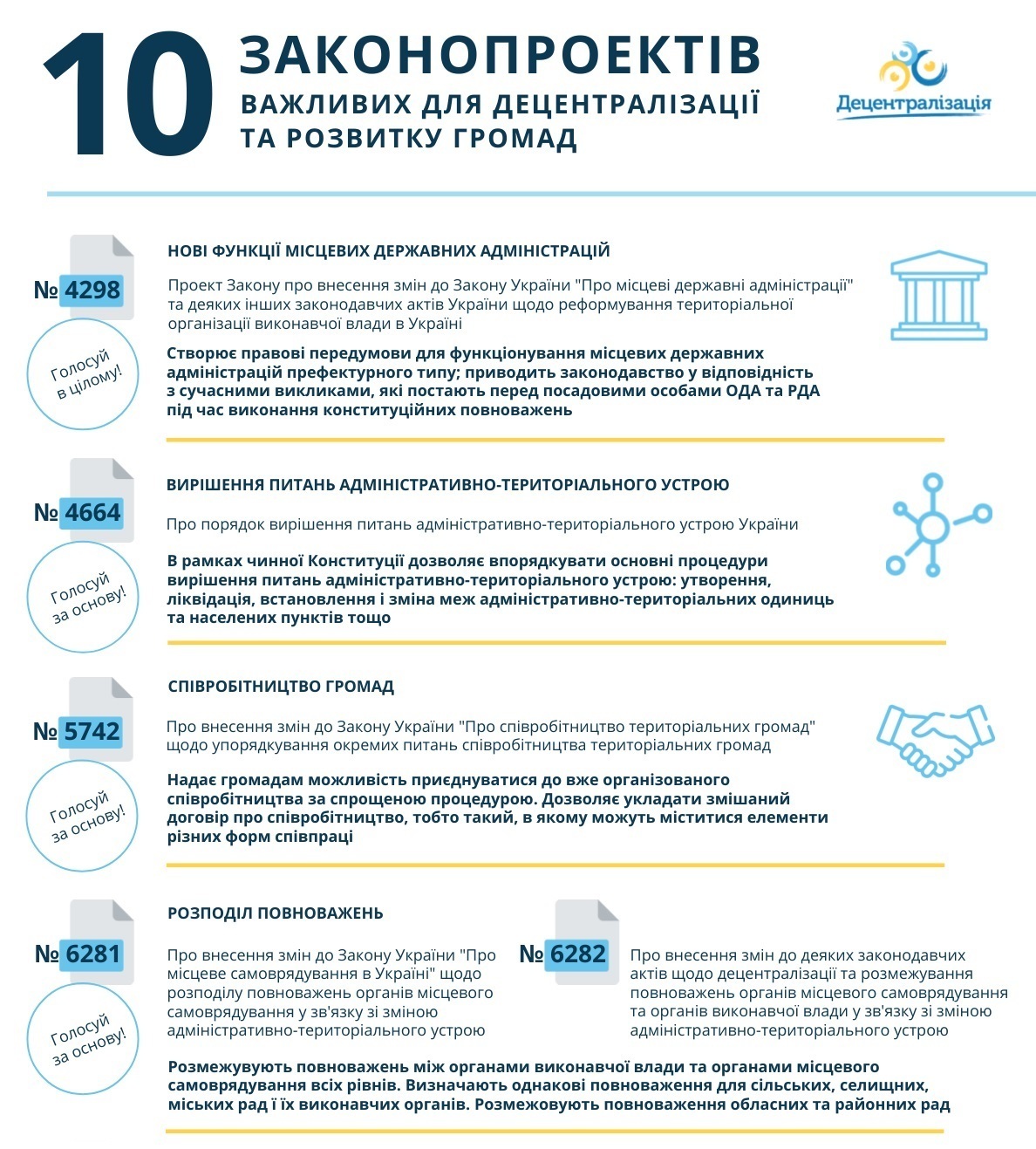 Крім того, за рік що минув, Верховна Рада прийняла декілька важливих для розвитку громад законів. Зокрема, народні депутати вдосконалили систему управління земельними ресурсами, впорядкували питання діяльності старост і створення старостинських округів, посприяли культурному розвитку громад і регіонів, створили стимули для будівництва в громадах індустріальних парків…