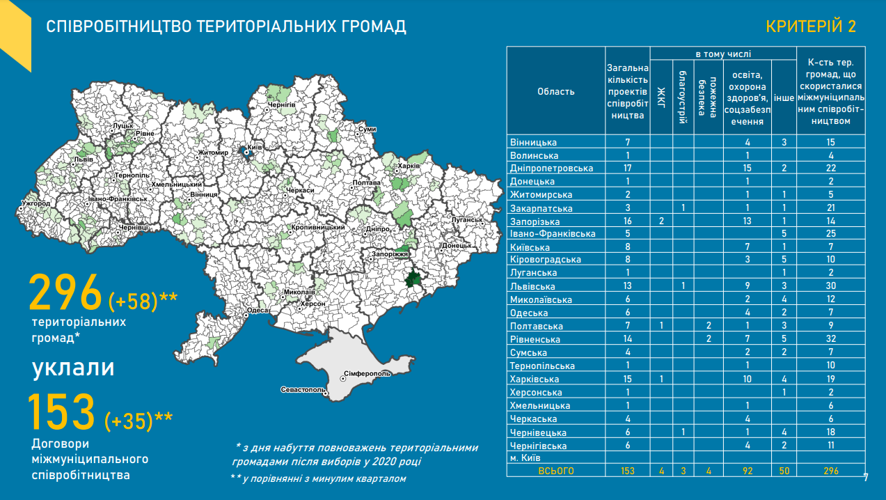 «З дня набуття повноважень територіальними громадами після виборів 2020 року 296 укрупнених територіальних громад уклали 153 договори про співробітництво, лише у четвертому кварталі 2021 року їх кількість збільшилася, у порівнянні з минулим кварталом, на 35 договорів. Міжмуніципальне співробітництво допомагає громадам єднатися та ефективно вирішувати спільні проблеми. Зокрема, обʼєднуючи сили та фінанси, органам місцевого самоврядування легше утримувати комунальні заклади, якими користуються й інші громади», — зазначив заступник Міністра.