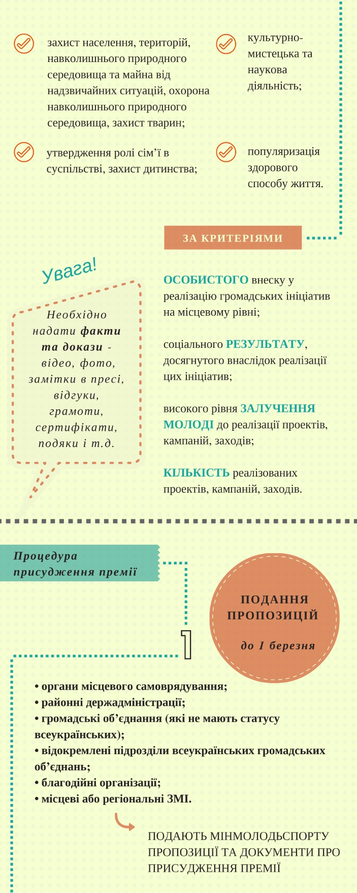 Для здобуття Премії районні, районні у мм. Києві та Севастополі держадміністрації, органи місцевого самоврядування, громадські об’єднання, які не мають статусу всеукраїнських, відокремлені підрозділи всеукраїнських громадських об’єднань, благодійні організації, місцеві або регіональні засоби масової інформації мають можливість подати до 1 березня 2022 року не більше як на одну особу.