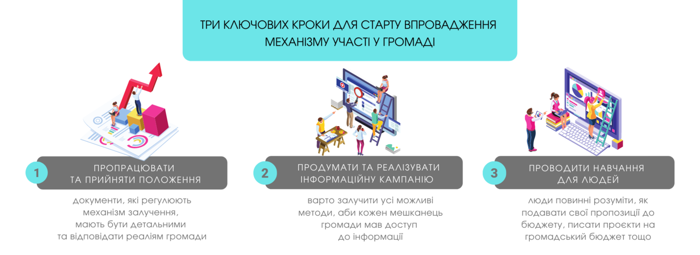 Особливості реалізації для кожного інструменту громада може обрати під себе. Проте перші кроки є загальними для всіх механізмів. Системне та поступове втілення забезпечить ефективну реалізацію.