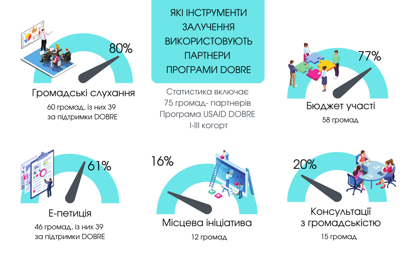 Програма USAID DOBRE пропонує партнерам значний перелік інструментів. Проте, за словами Анни Товстухи, найпопулярнішим є громадський бюджет. Це коли з бюджету громади виділяють кошти на проєкти людей, а переможець обирається шляхом голосування. Помилково вважати, що це "дороговартісний механізм", адже громада виділяє кошти залежно від своїх можливостей. Це може бути навіть 10 тисяч гривень.