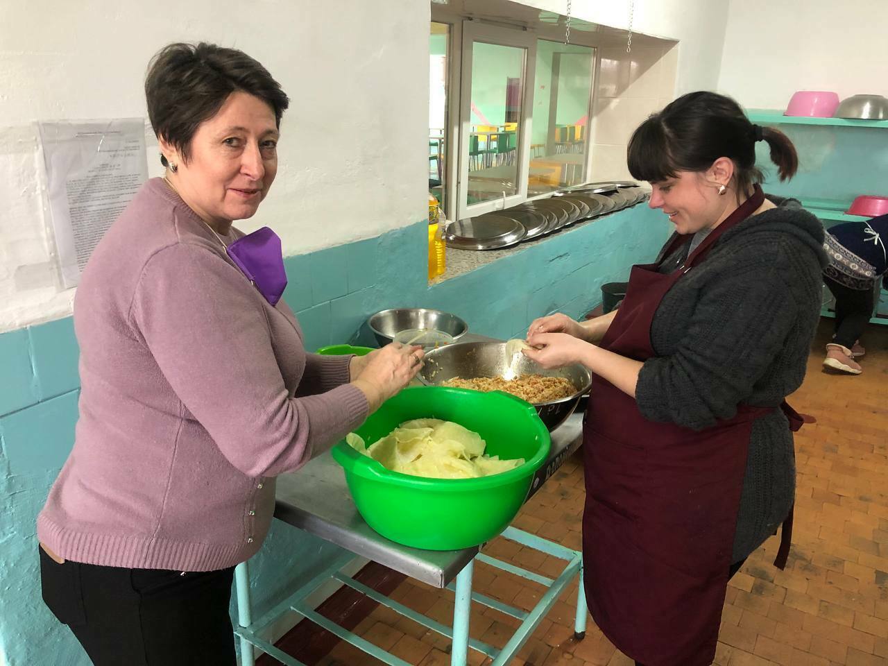 Виконуюча обов’язки Маловисківського ліцею Аліна Самченко та заступниця директора Галина Ільченко готують голубці для захисників.
