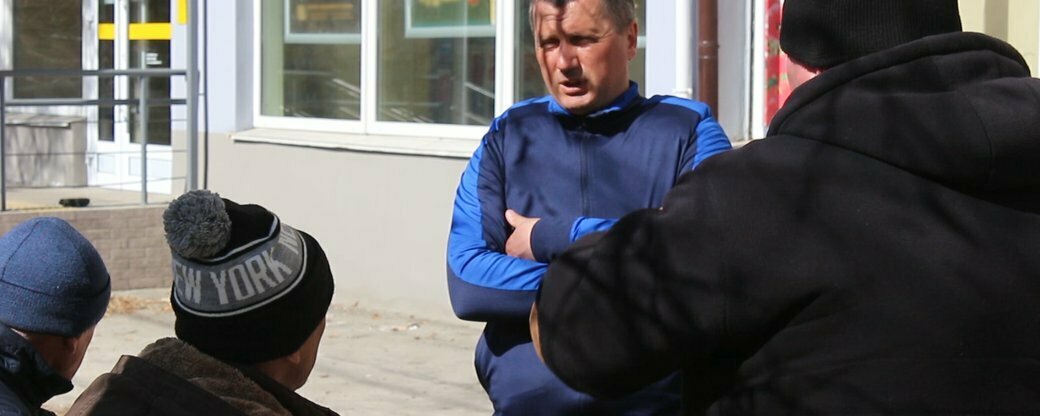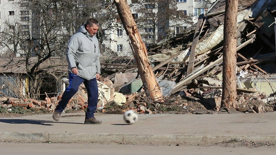 Далі міський голова йде грати навпроти зруйнованої мерії в футбол з бійцем територіальної оборони. Так він долає негатив. Нашвидкуруч – обід у волонтерському центрі, де годують тих, хто втратив все.
