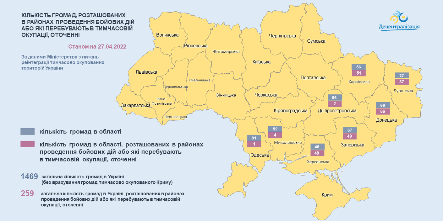 Міністерство з питань реінтеграції тимчасово окупованих територій України затвердило оновлений перелік територіальних громад, що розташовані в районах проведення воєнних (бойових) дій або які перебувають в тимчасовій окупації, оточенні (блокуванні) станом на 27.04.2022 року.