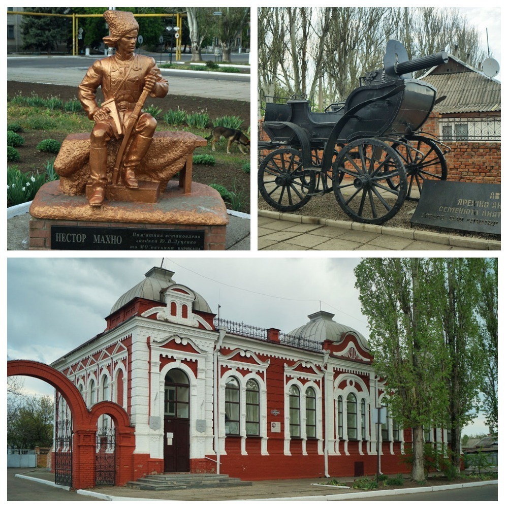 А от будівля колишнього місцевого банку німецьких та єврейських колоністів із кількаметровими мурами, що знаходиться неподалік центральної площі міста, збереглася. Говорять, цей банк був одним із найнадійніший чи не у всій тодішній російській імперії. Тепер тут розміщується районний краєзнавчий музей. І тут дбайливо зберігають пам’ятки, пов’язані з батьком Махном.