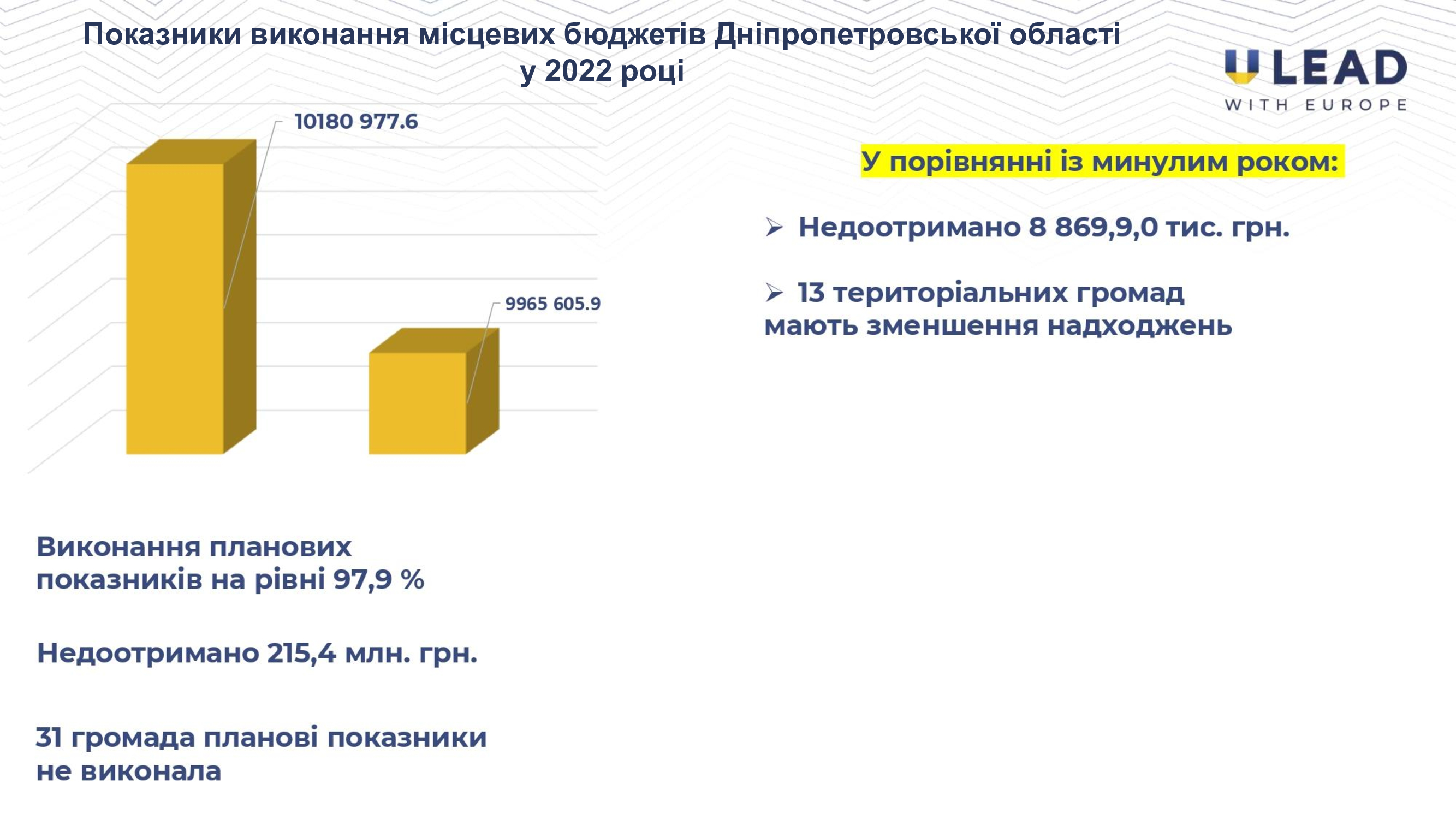 При цьому спостерігаються втрати місцевих бюджетів у зв’язку з припиненням господарської діяльності ряду підприємств та господарств, скороченням персоналу та іншими непередбачуваними обставинами. Наприклад, у 16 громадах Дніпропетровської області податкові надходження зменшилися у порівнянні із січнем – квітнем 2021 року. В абсолютних цифрах ця сума становить 8,9 млн грн.