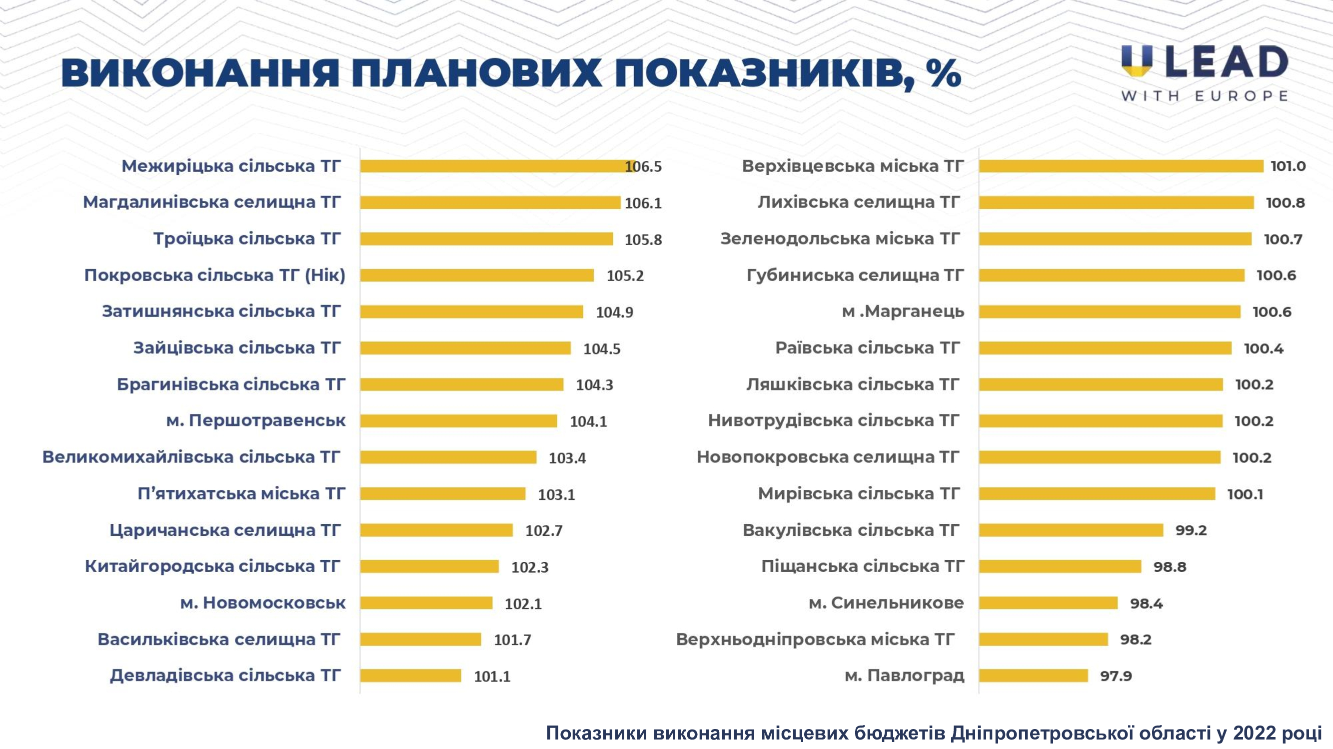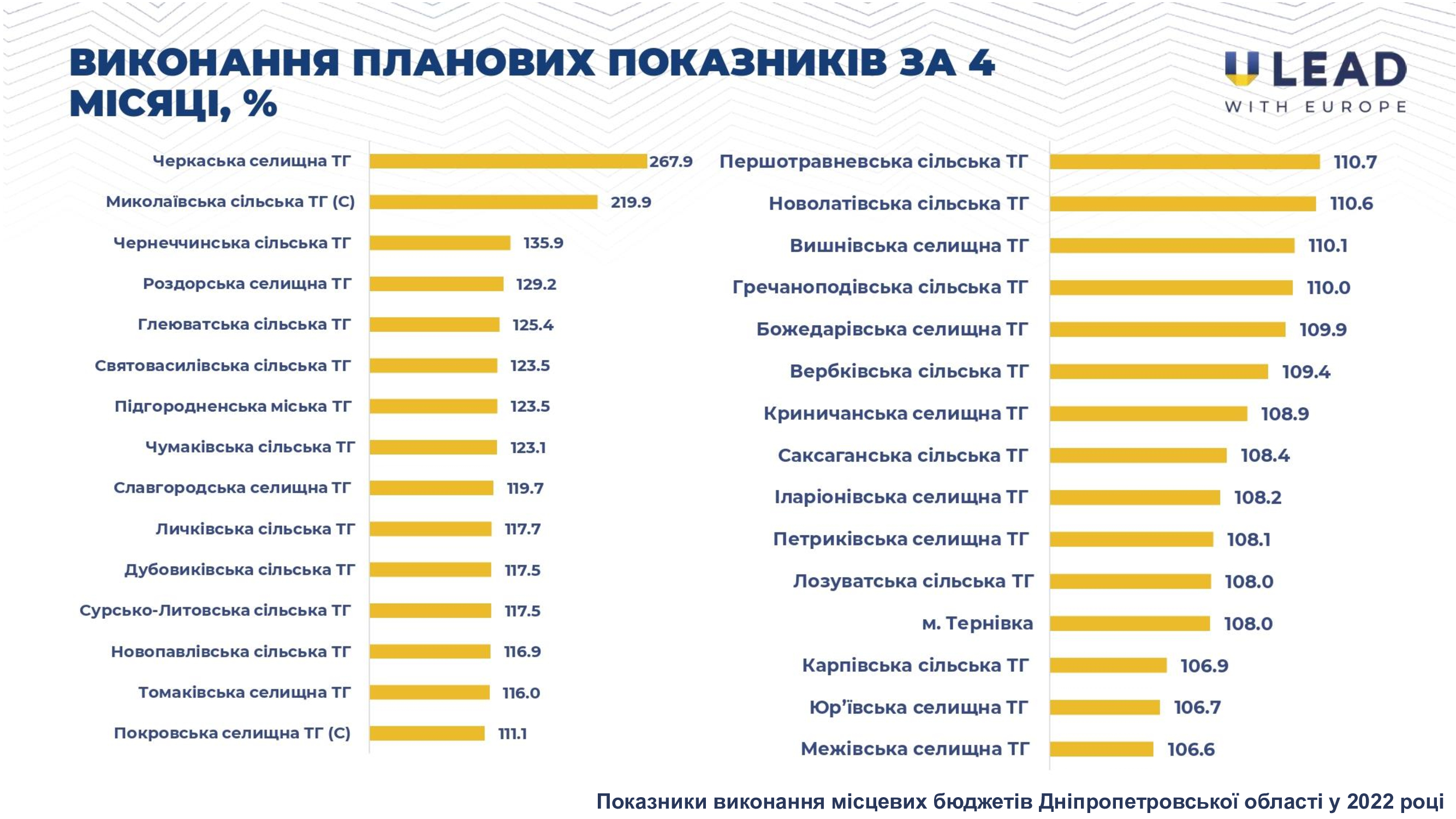 Найкращі показники щодо приросту податкових надходжень мають Черкаська селищна територіальна громада – 182,2 млн. грн. або 384 % та Миколаївська сільська територіальна громада Синельниківського району – 16,8 млн. грн. або 75 %.