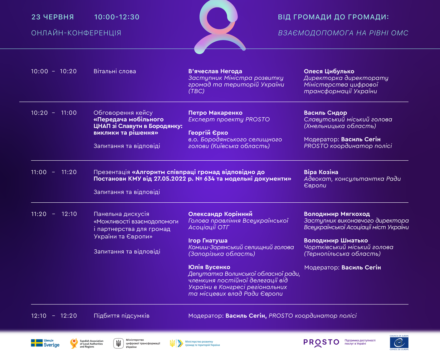 23 червня (четвер) з 10:00 до 12:30, шведсько-український проект PROSTO «Підтримка доступності послуг в Україні» проведе онлайн-конференцію, присвячену можливостям взаємодопомоги між громадами України та Європи на рівні органів місцевого самоврядування.