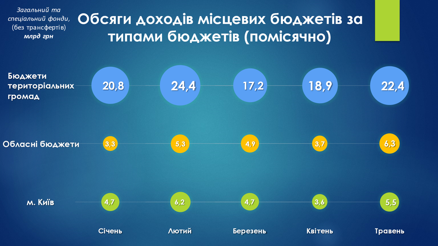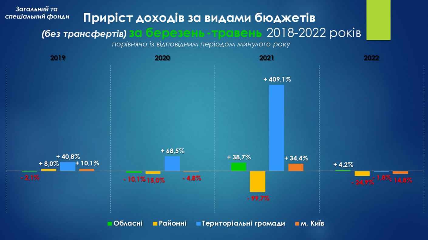 Найбільших втрат зазнав бюджет міста Києва. При цьому, обласні бюджети не зазнали таких значних коливань, як бюджети територіальних громад, які загалом відновили темпи приросту на рівні більше 16%.