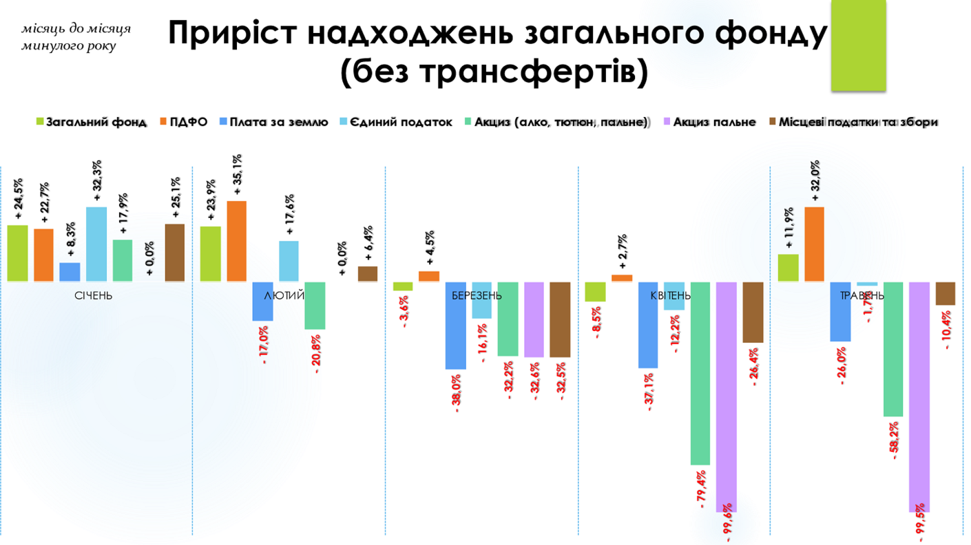 Загалом в травні вже можна спостерігати покращення ситуації. На наступному слайді чітко простежується, що найбільш стрімке падіння майже по всіх доходах було в квітні. Нині бізнес адаптувався. В свою чергу, державна податкова служба активізувала роботу зі стягнення плати за землю, надійшла рентна плата, ПДФО стабільно зростає, порівняно з 2021 роком (внаслідок значної кількості військовослужбовців з гідним грошовим забезпеченням). При цьому, внаслідок скасування загальнодержавного акцизу на пальне (встановлення ставки на рівні 0 євро за 100 літрів), місцеві бюджети, які з 1 січня 2017 року отримують певну частку (13,44%) від надходжень загальнодержавного акцизу (змінено механізм зарахування акцизу з пального через перерозподіл з державного бюджету), відчули значні втрати цього виду надходжень, що було зумовлено необхідністю врегулювання ситуації на ринку пального.
