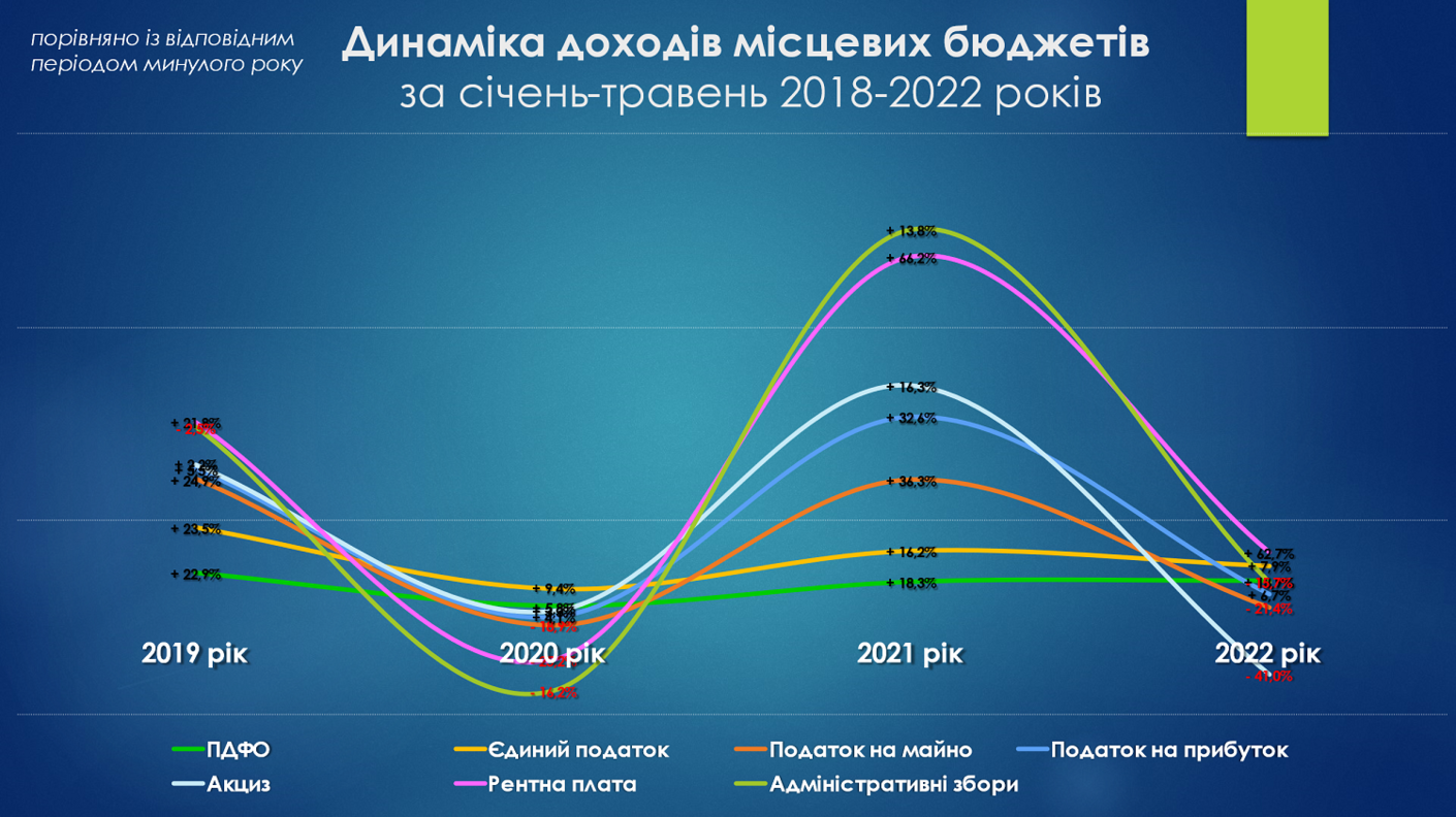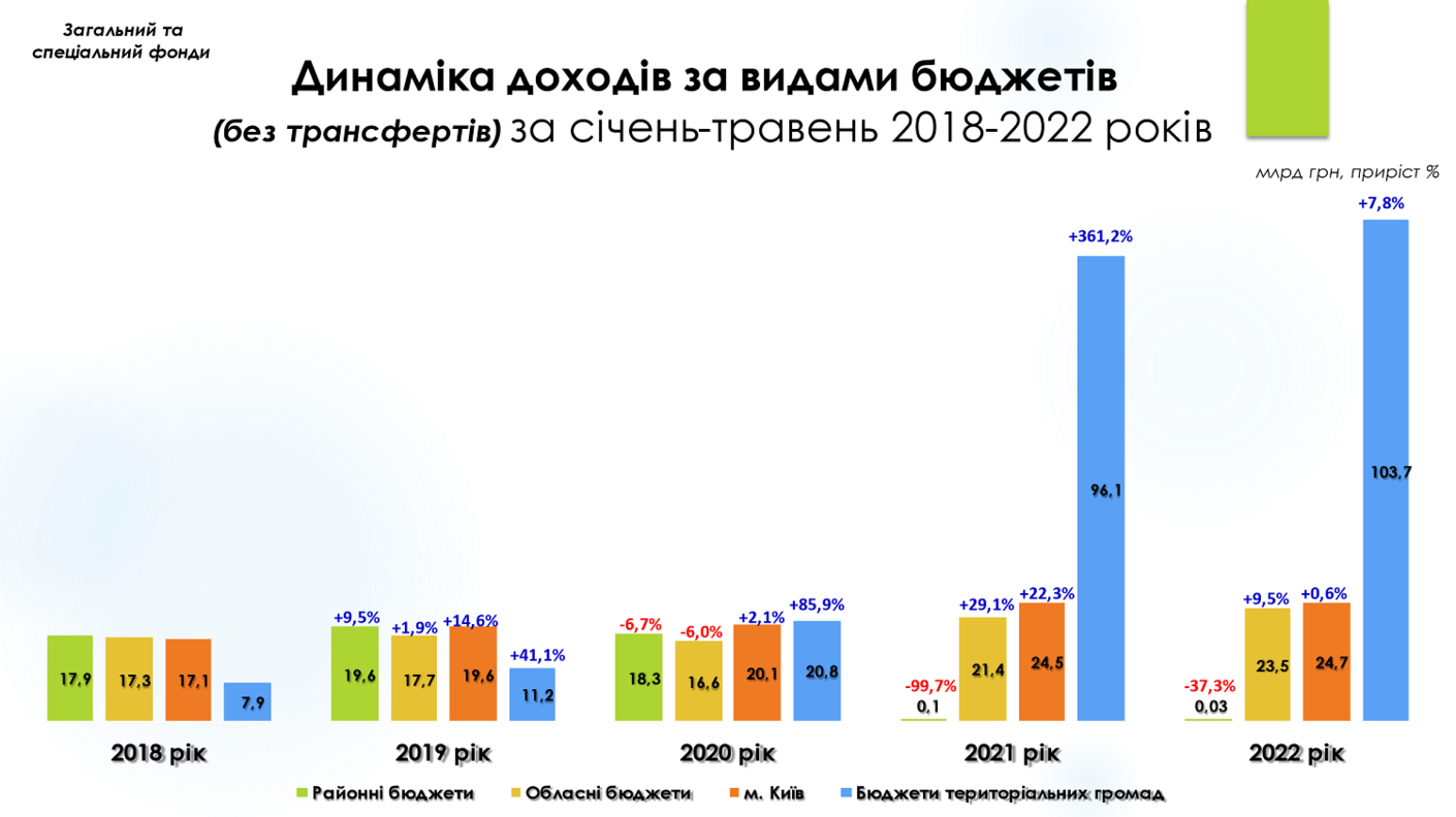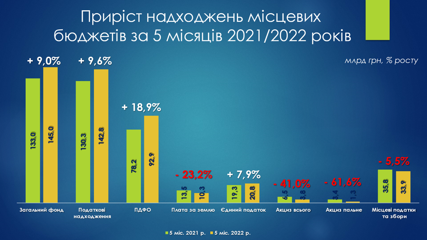Загалом доходи загального фонду місцевих бюджетів за 5 місяців 2022 року, в порівнянні з відповідним періодом минулого року, зросли на 9%. Це спричинено значним ростом надходжень в перші два місяці 2022 року.