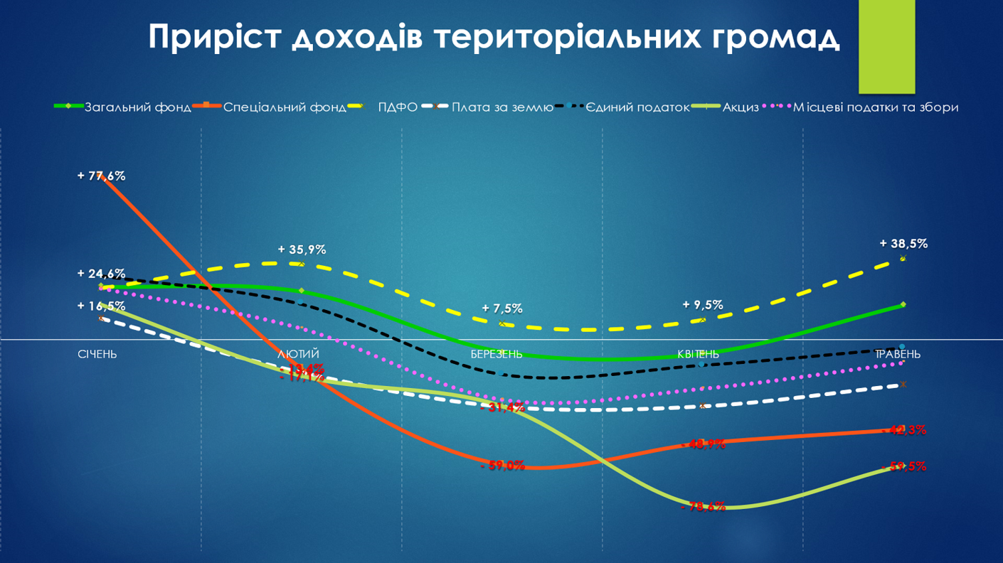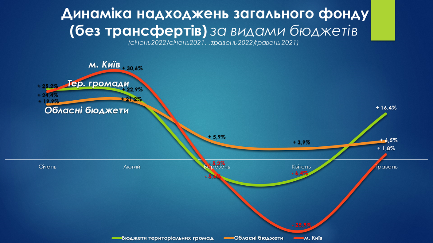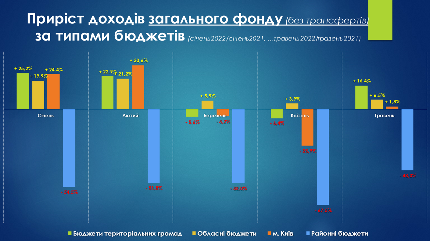Так, падіння приросту доходів загального фонду територіальних громад в квітні на рівні 6,4%, по відношенню до відповідного періоду минулого року, не завадило відновленню надходжень в травні на рівні 16,4%, в порівнянні з відповідним періодом 2021 року. Обласні бюджети єдині демонструють загалом позитивний приріст надходжень загального фонду протягом всього періоду військового протистояння України проти росії, в порівнянні показників певного місяця 2022 року до відповідного місяця минулого року.