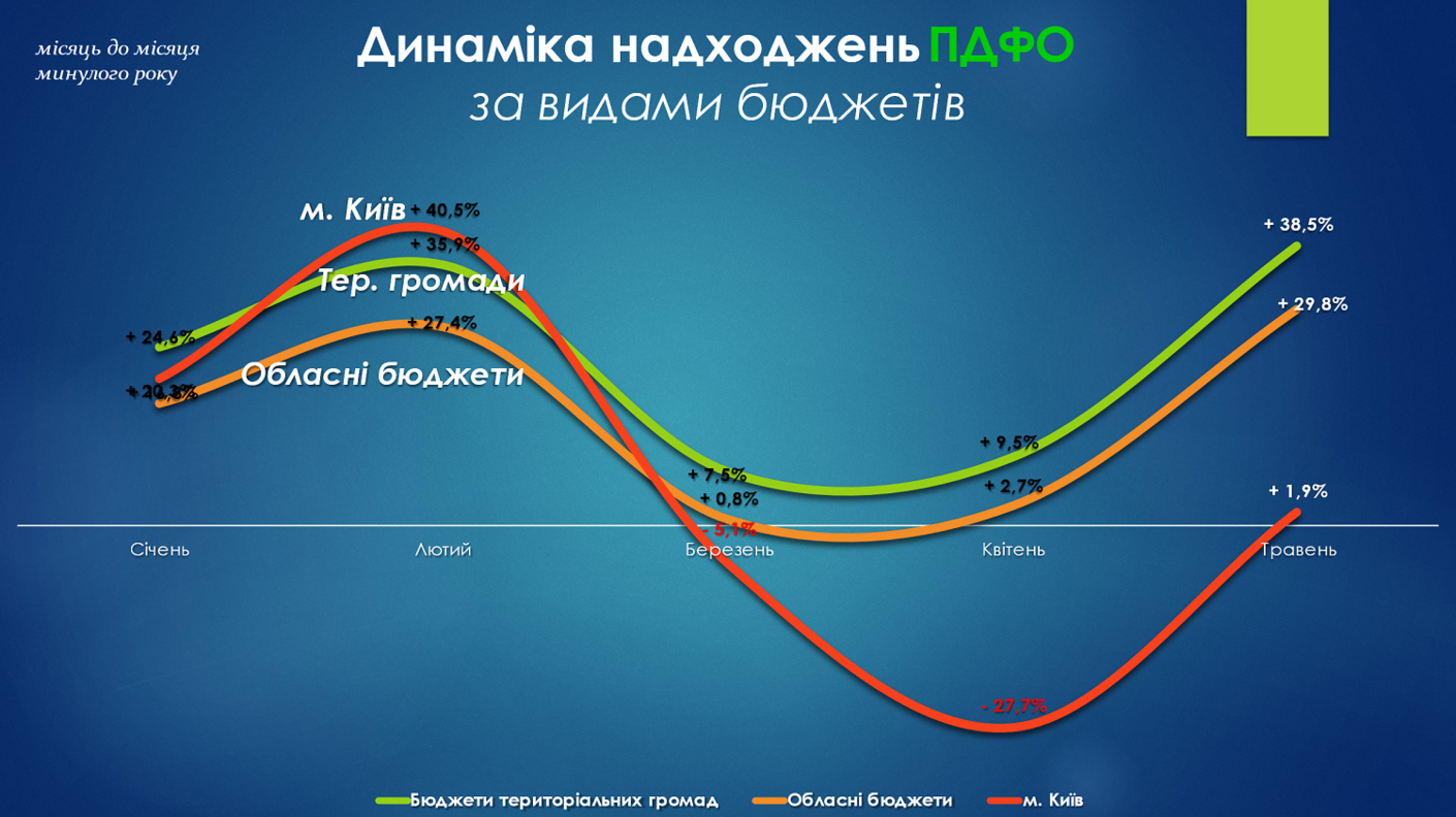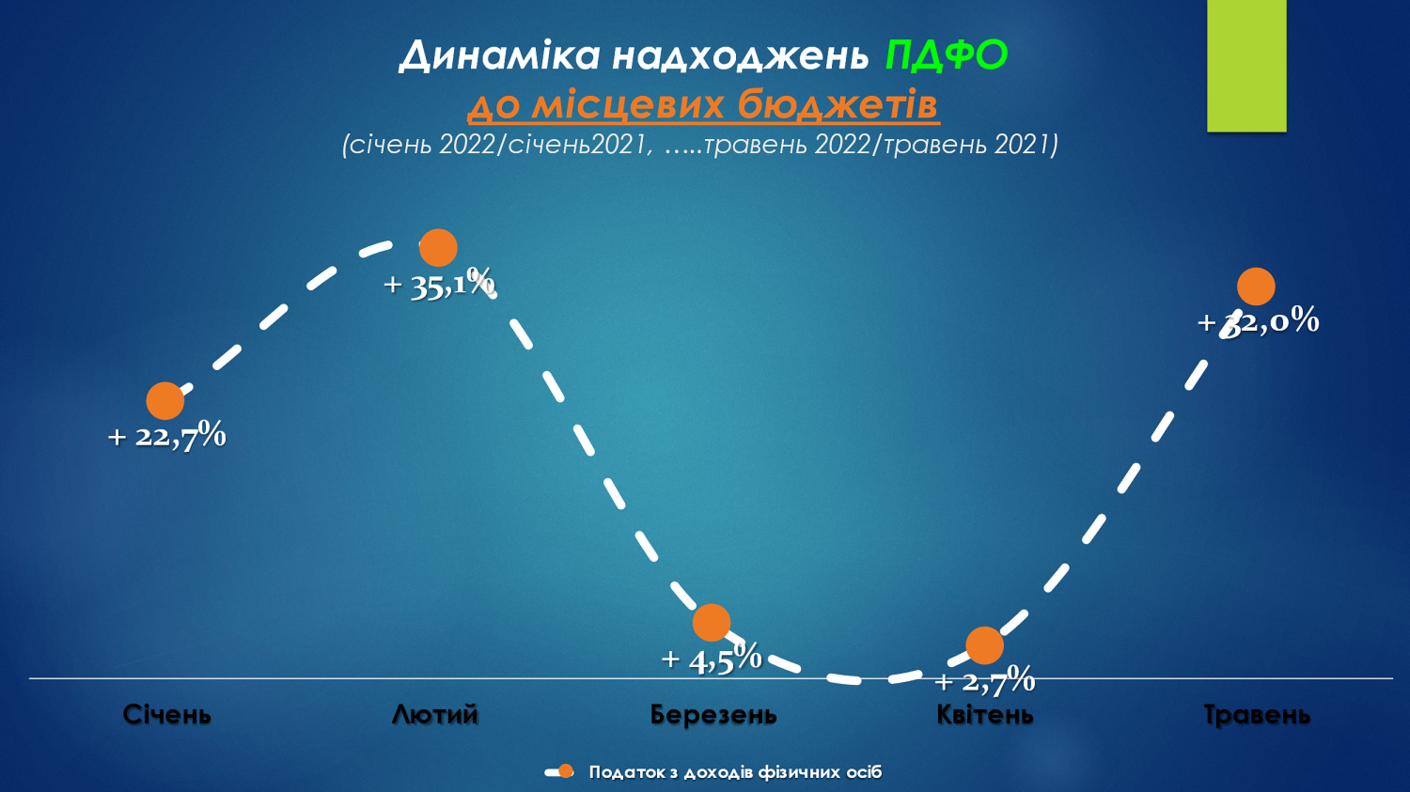 Надходження податку з доходів фізичних осіб до місцевих бюджетів протягом січня-травня 2022 року завжди знаходились в додатному значенні. Це зумовлено, по-перше, зростанням відрахувань із заробітних плат військовослужбовців, по-друге, свою роль відіграло збільшення нормативу зарахування ПДФО до місцевих бюджетів із 60% до 64% з початку 2022 року.