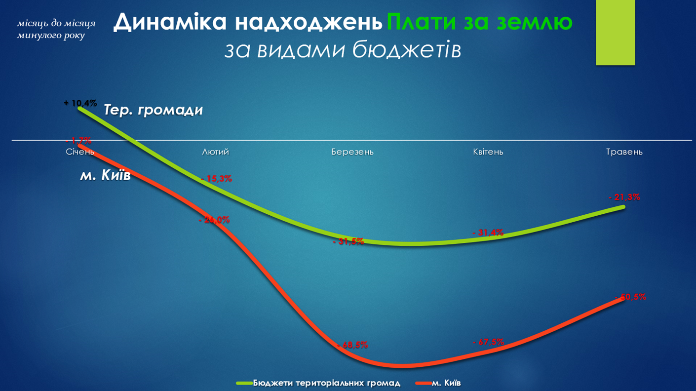 Значно більших втрат зазнав бюджет міста Києва, зниження надходжень плати за землю до якого в березні досягнуло майже 70%, в порівнянні з березнем 2021 року (-0,3 млрд грн за березень лише по одному бюджету), майже аналогічні втрати Києва по платі за землю за квітень 2022 року.