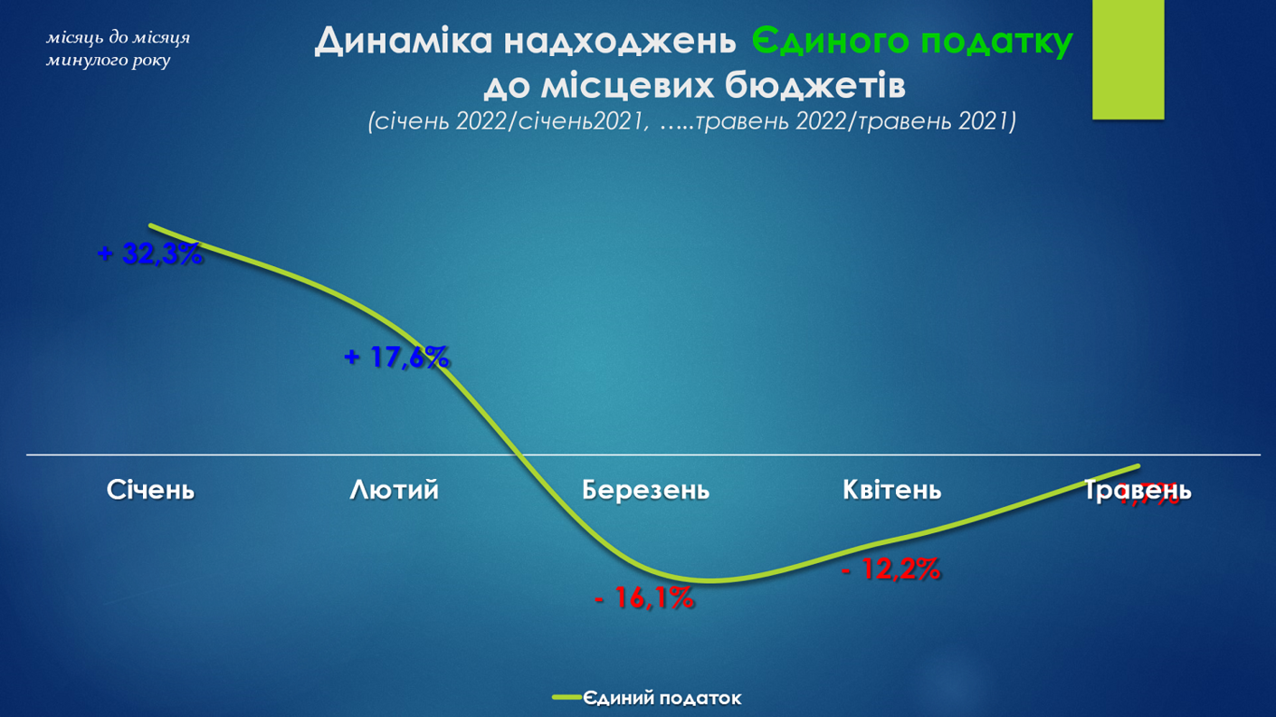 Приріст надходжень Єдиного податку в травні майже відновив додатне значення. Цьому слугували зміни до податкового законодавства описані вище. І хоча в березні-травні від’ємний приріст, загалом надходження єдиного податку до місцевих бюджетів за 5 місяців зросли на 1,5 млрд гривень, порівняно з січнем-травнем 2021 року.