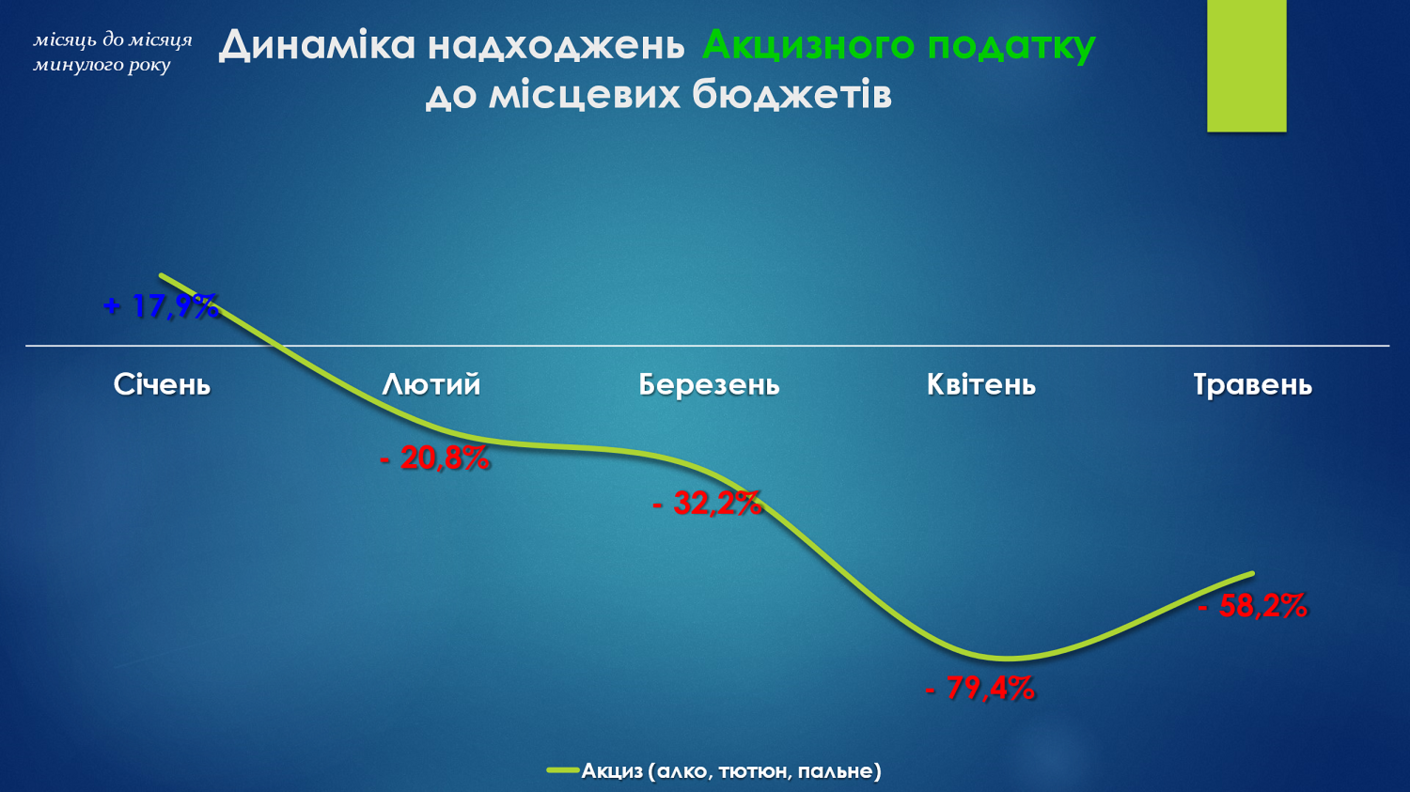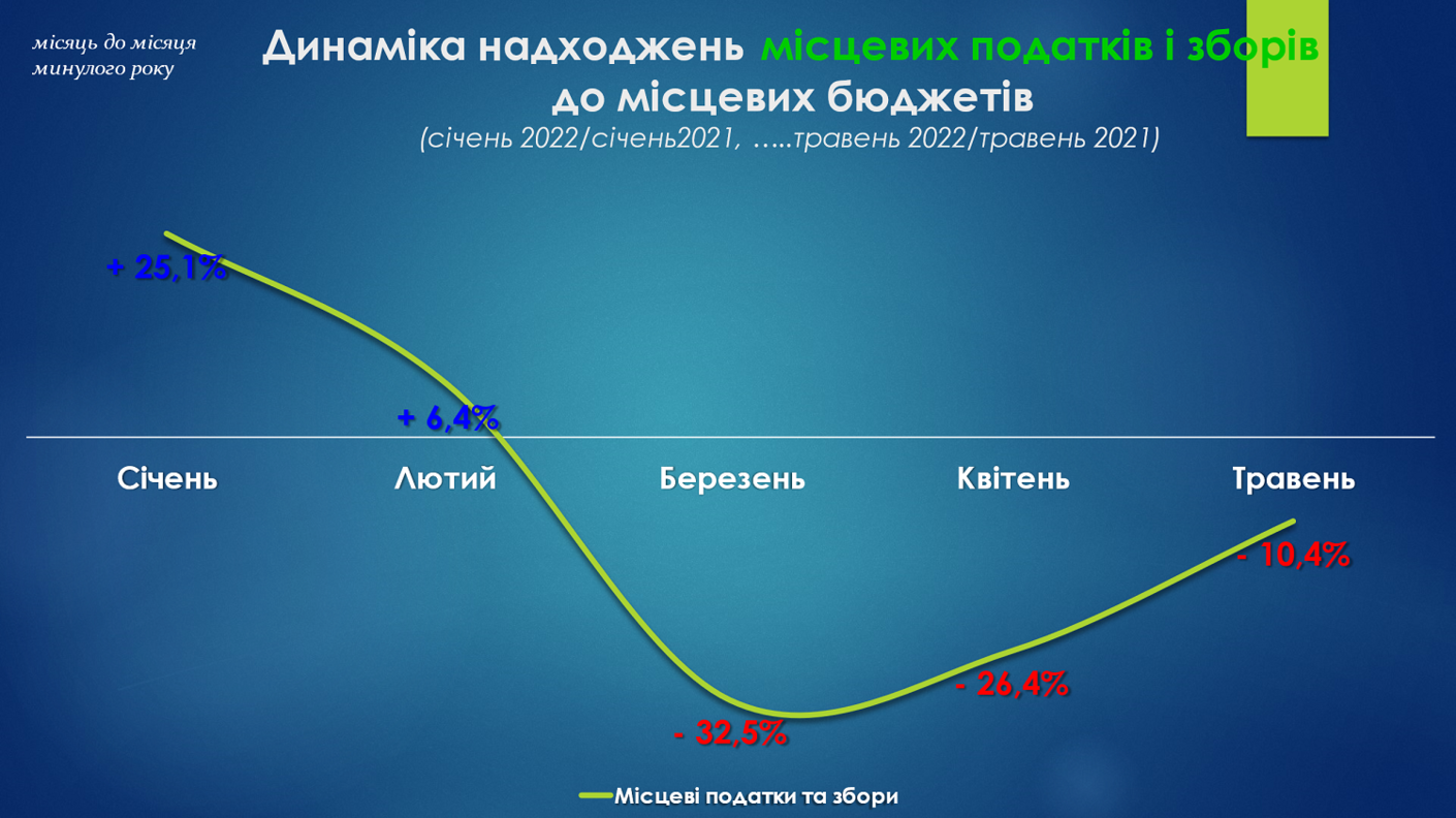 Починаючи з квітня, місцеві податки і збори також відновили тенденцію до зростання, хоча надходження ще не вийшли на додатний приріст. Прогнозовано в червні очікується позитивний приріст.