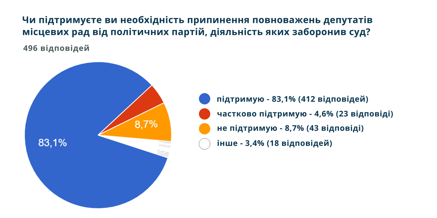 Варіант відповіді «Так, повністю підтримую припинення повноважень» обрали 83% учасників опитування. Ще 4,6% висловилися за тимчасове призупинення повноважень на період військового стану. 8,7% відповіли, що не підтримують дострокове припинення повноважень місцевого депутата, партія якого заборонена судом.