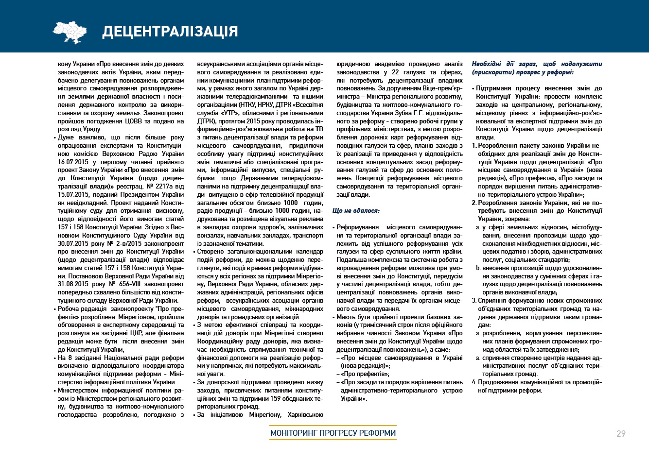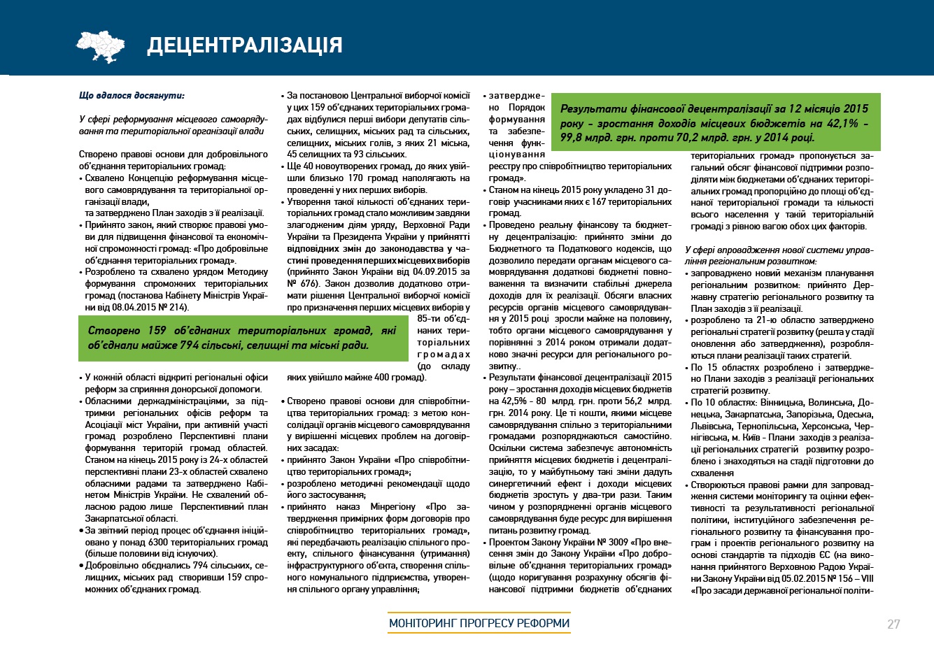 Децентралізація владних повноважень в Україні, у порівнянні з деякими іншими реформами, що проводяться в Україні, займає лідируючі позиції. Такий висновок можна зробити з даних «Моніторингу прогресу реформ за 2015 рік», опублікованому проектним офісом Національної ради реформ.