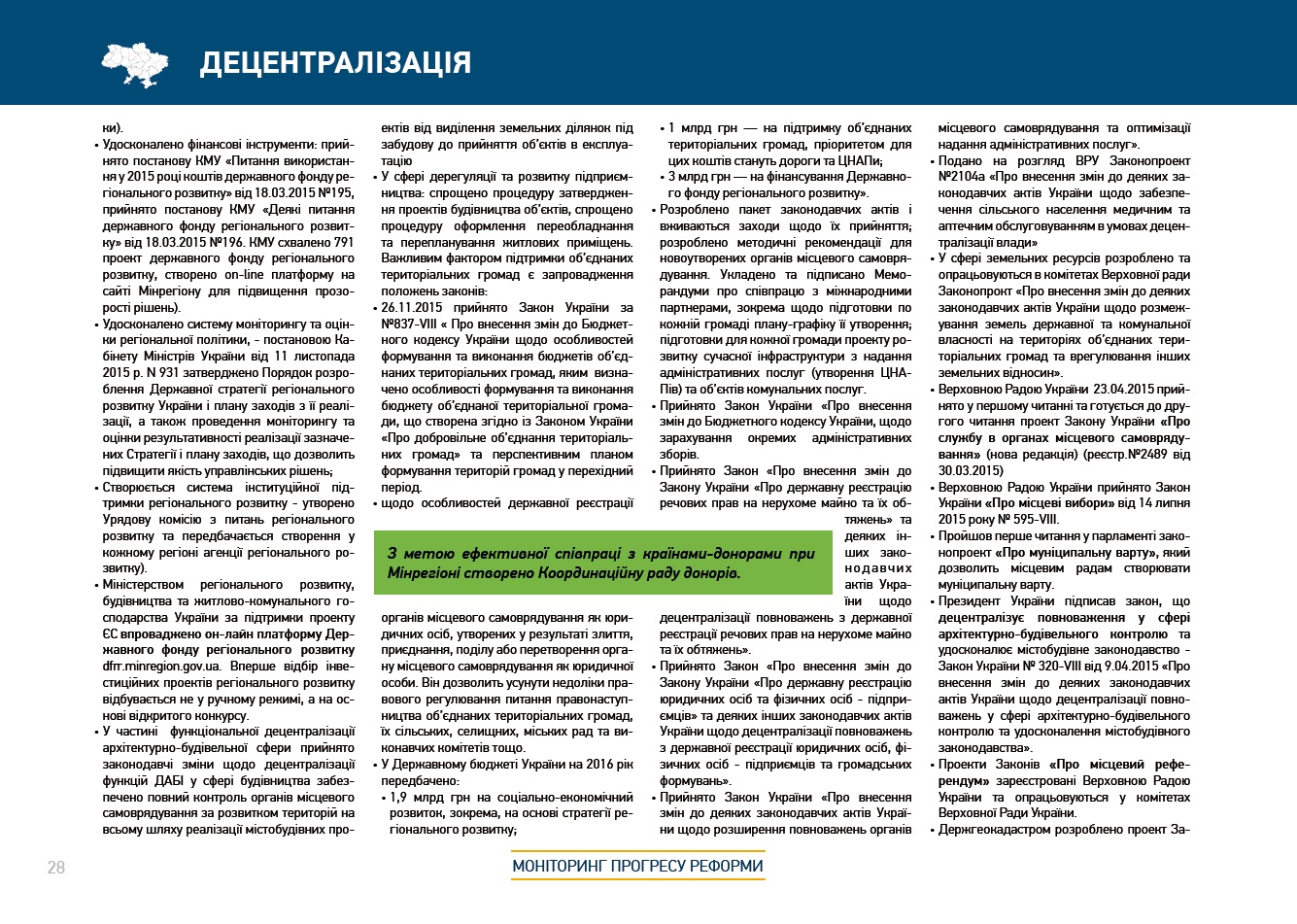 За інформацією, наведеною в моніторингу, у сфері реформування місцевого самоврядування та територіальної організації влади створено правові основи для добровільного об’єднання територіальних громад: