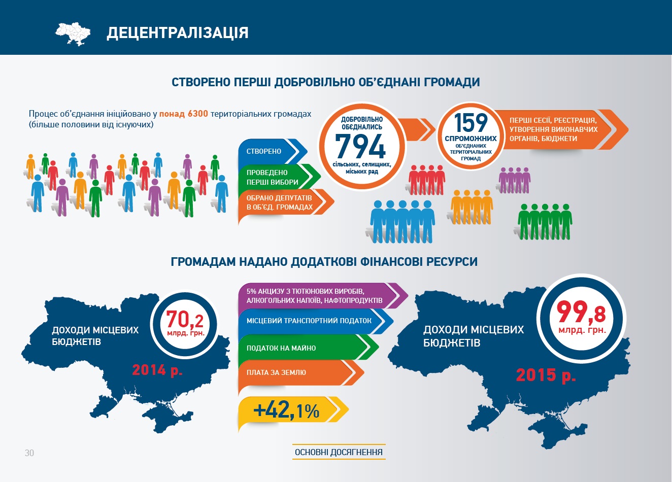 Окремо варто відзначити дані щодо фінансової і бюджетної децентралізації: прийнято зміни до Бюджетного та Податкового кодексів, що дозволило передати органам місцевого самоврядування додаткові бюджетні повноваження та визначити стабільні джерела доходів для їх реалізації. Обсяги власних ресурсів органів місцевого самоврядування у 2015 році зросли майже на половину, тобто органи місцевого самоврядування у порівнянні з 2014 роком отримали додатково значні ресурси для регіонального розвитку.