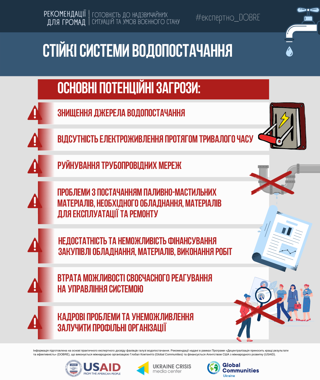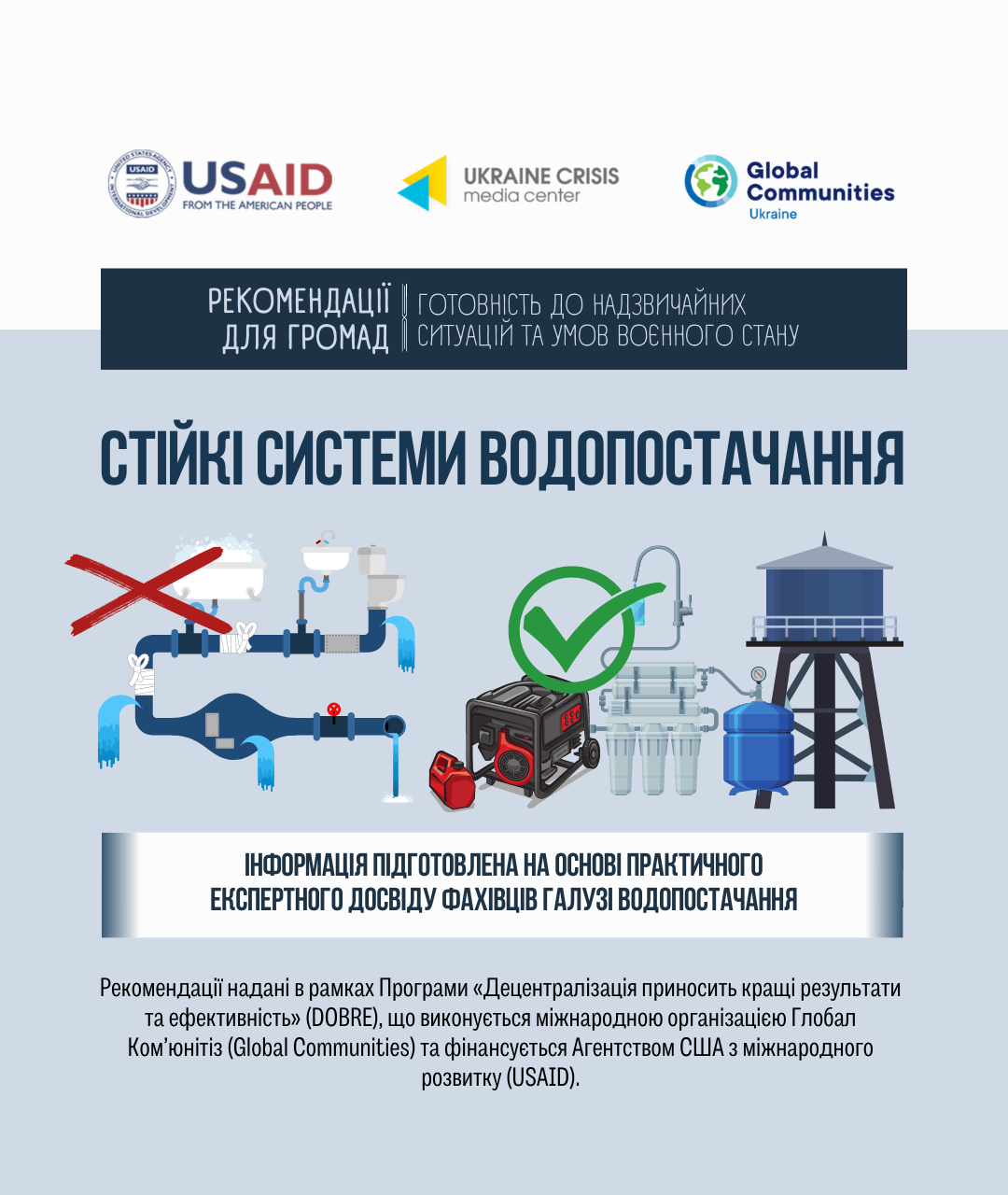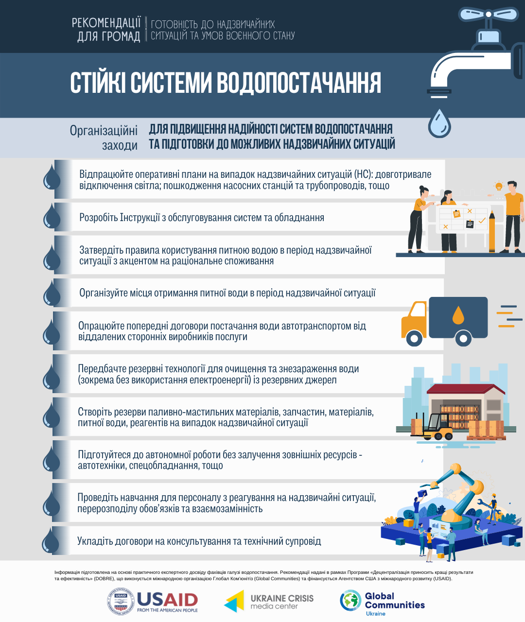 Наведені рекомендації можуть бути використані територіальними громадами України для підготовки до можливих надзвичайних ситуацій. Інформація підготовлена на основі практичного експертного досвіду фахівців галузі водопостачання.