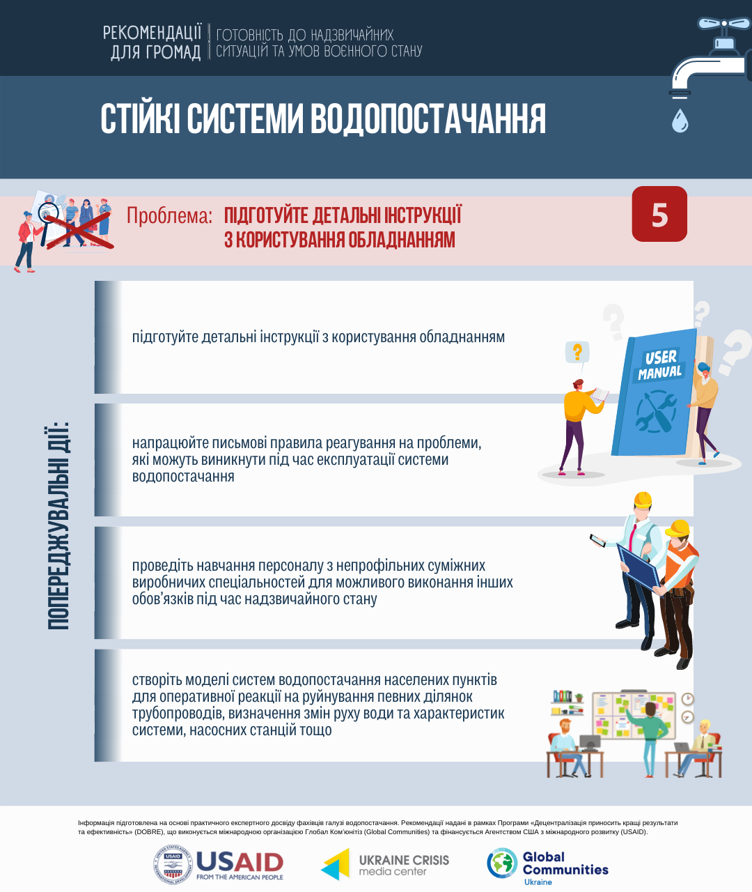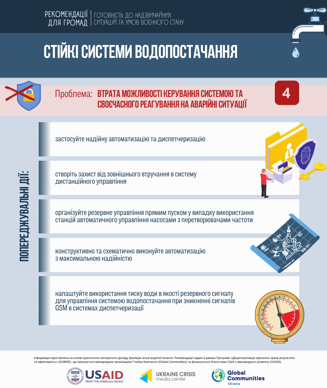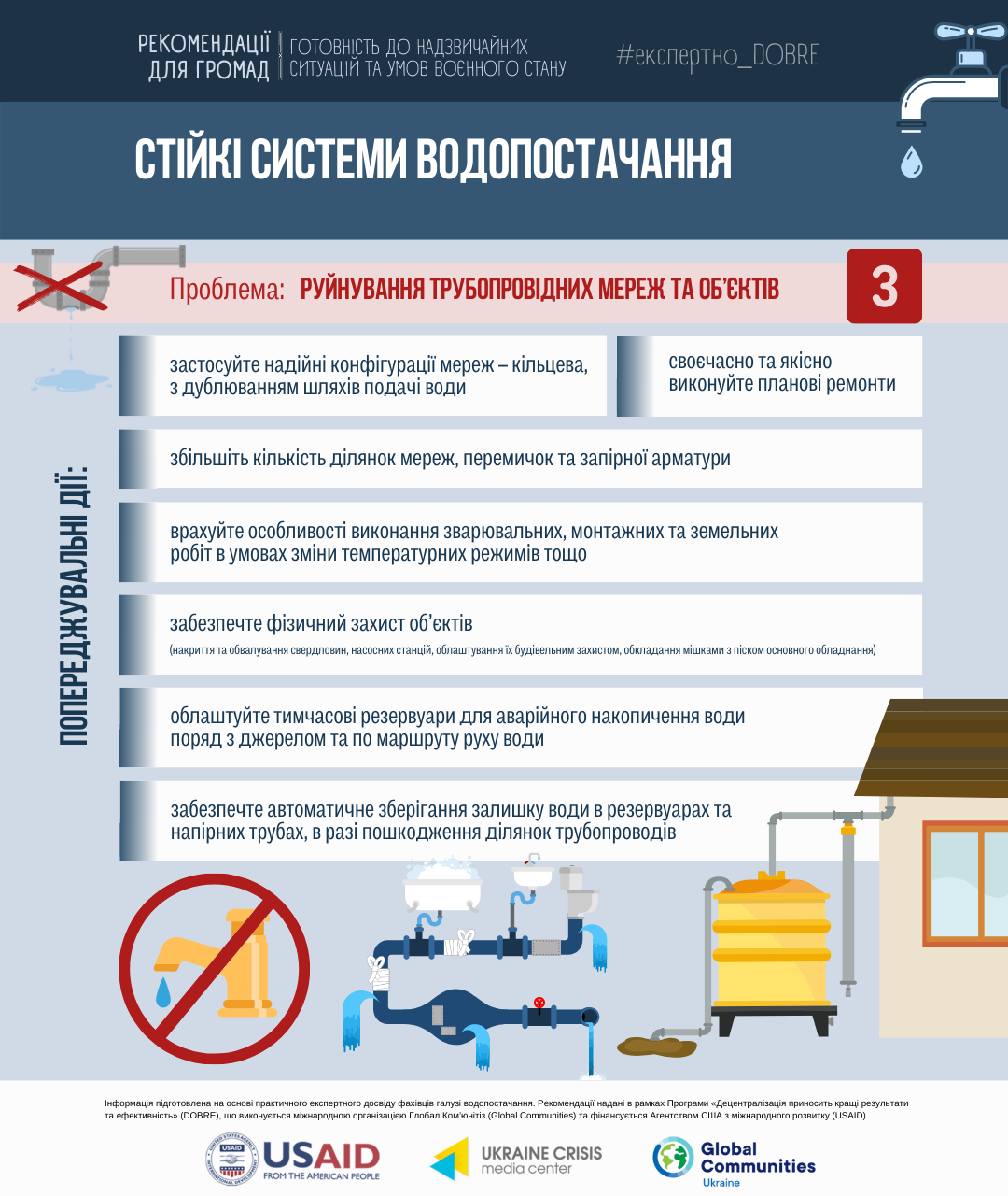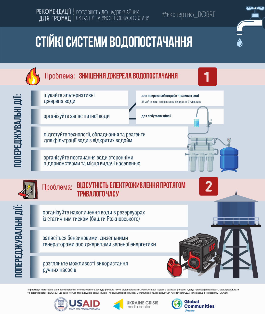 Наведені рекомендації можуть бути використані територіальними громадами України для підготовки до можливих надзвичайних ситуацій. Інформація підготовлена на основі практичного експертного досвіду фахівців галузі водопостачання.