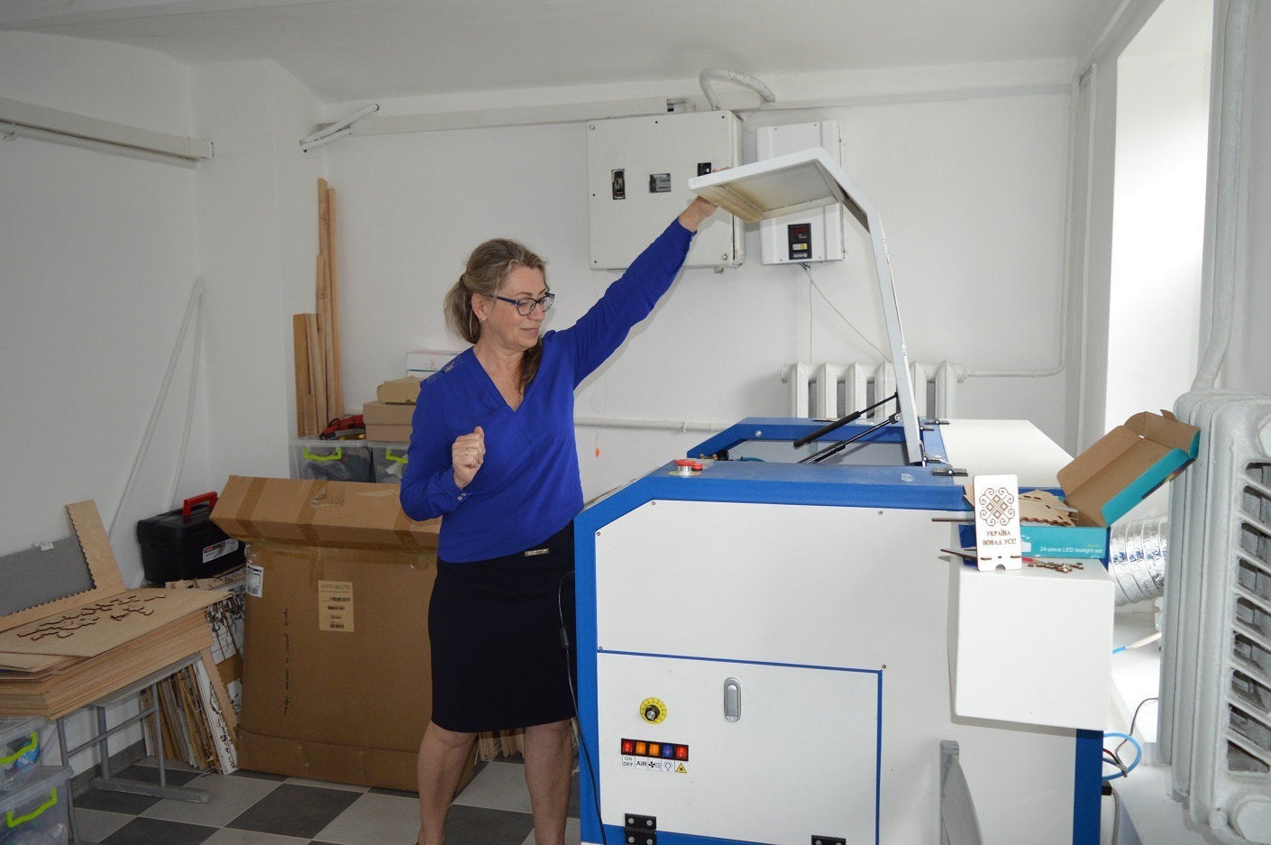 Директорка Підволочиського центру дитячої та юнацької творчості Неля Ярема показує, як працює лазерний різак у студії робототехніки