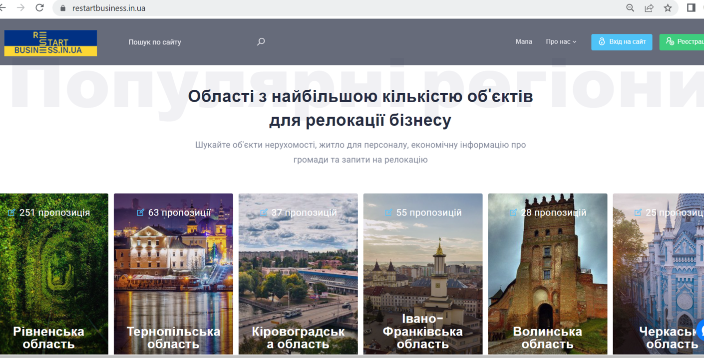 Рівненська обласна державна адміністрація у співпраці з Волинським ресурсним центром розробила портал з релокації бізнесів restartbusiness.in.ua, який з 12 квітня 2022 року дає можливість всім українським підприємствам із територій, охоплених бойовими діями, оперативно отримати інформацію про об'єкти нерухомості, придатні для оренди або продажу, а також спільно із залученням територіальних громад та спеціалізованих установ області регулярно оновлює базу даних земельних ділянок та об’єктів нерухомості, які можуть бути запропоновані представникам бізнесу постраждалих регіонів України для тимчасового чи постійного розміщення виробничих потужностей.