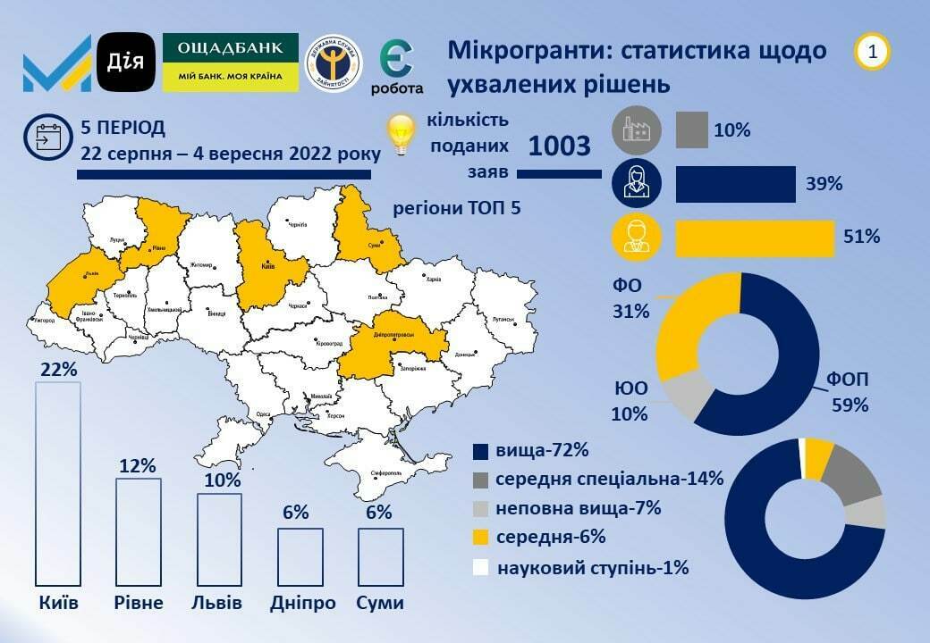 Графіка – Державна служба зайнятості Статистика ухвалених рішень щодо V періоду прийому заяв на мікрогранти (22 серпня – 4 вересня 2022 року). Рівненщина – у ТОП 5 областей України.