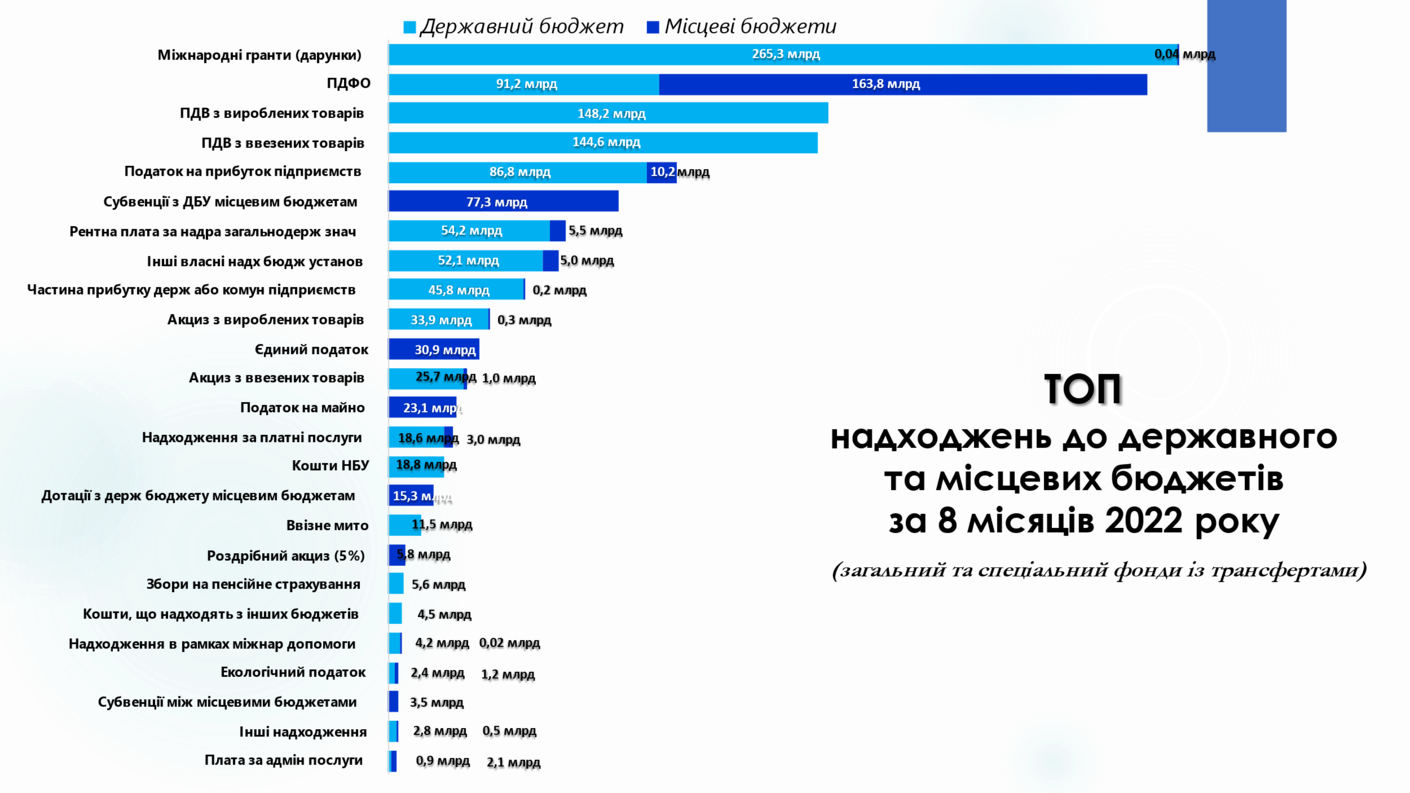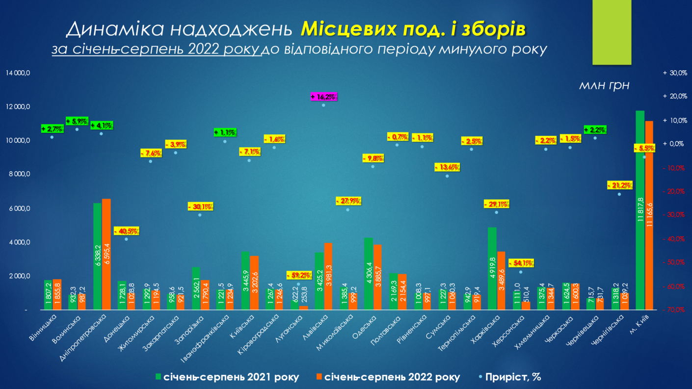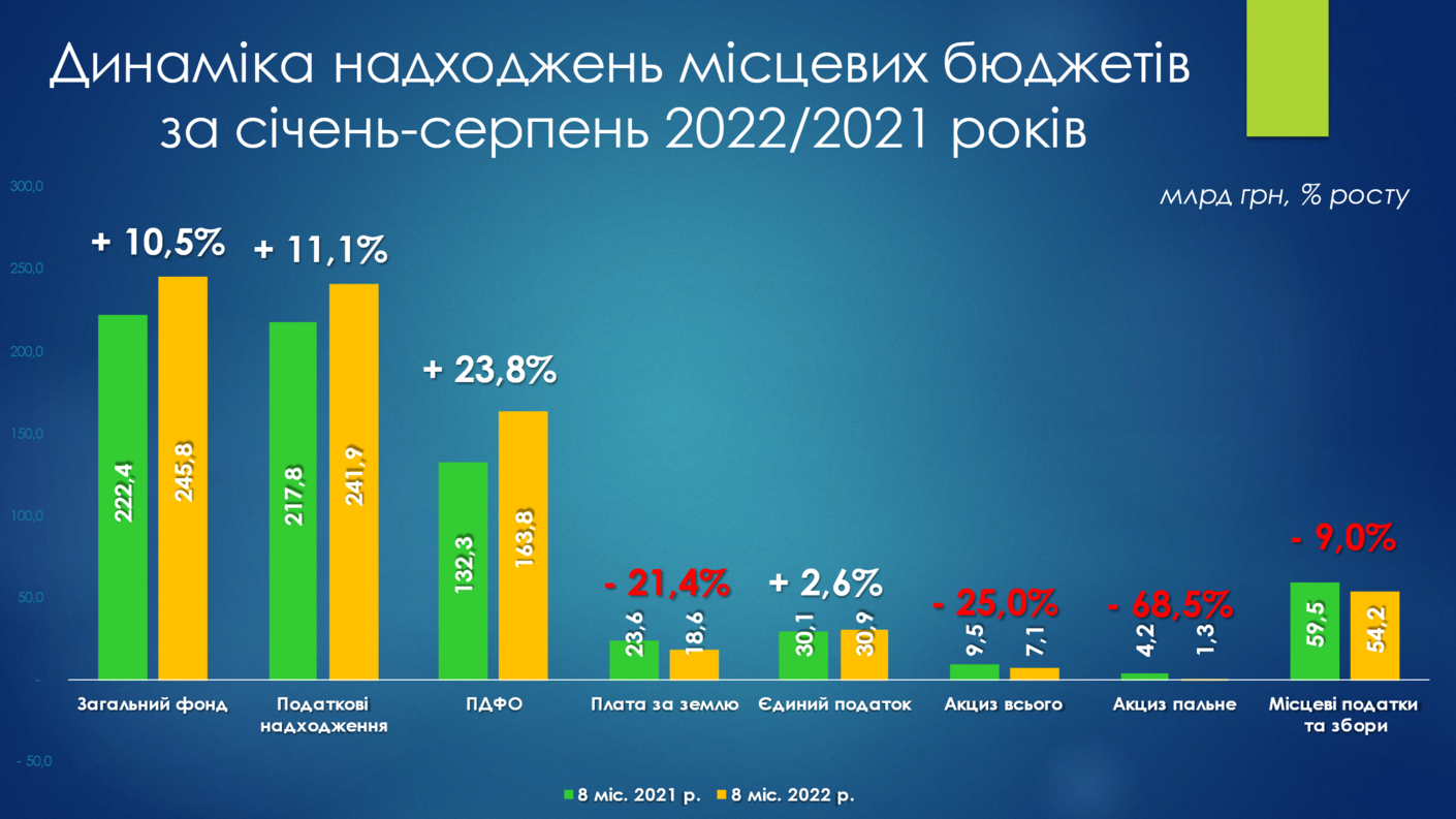 Загалом за 8 місяців 2022 року до загального фонду місцевих бюджетів (без урахування міжбюджетних трансфертів) надійшло 245,8 млн грн, що становить +10,5% або + 23,4 млрд грн приросту проти січня-серпня 2021 року. Це в основному зумовлено значним ростом податку з доходів фізичних осіб (+23,8%), адже втрати від надходжень плати за землю в порівнянні із відповідним періодом минулого року складають -21,4%
