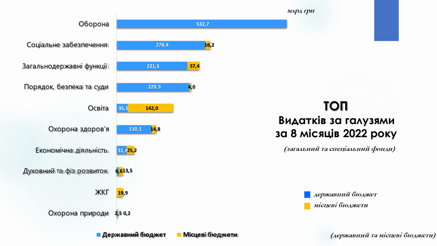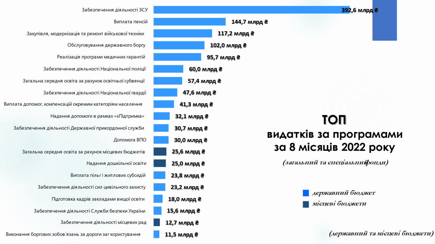При цьому, найбільше коштів з державного та місцевих бюджетів витрачається на ЗСУ, пенсії та обслуговування боргу. Нижче відображено найбільші за обсягами видатки за бюджетними програмами за січень-серпень 2022 року (із розподілом між державним та місцевими бюджетами).