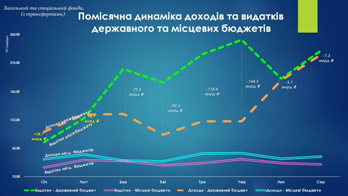 Зважаючи, що сектор безпеки та оборони належить до повноважень держави, на нижченаведеному графіку простежується значне зростання видаткової частини державного бюджету. Натомість місцеві бюджети не зазнали таких коливань відносно державного бюджету. Дефіцит державного бюджету в березні-червні сягав максимальних за всю історію розмірів (майже 150 млрд грн на місяць).