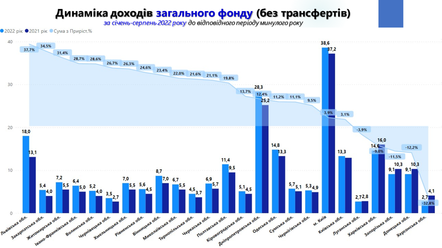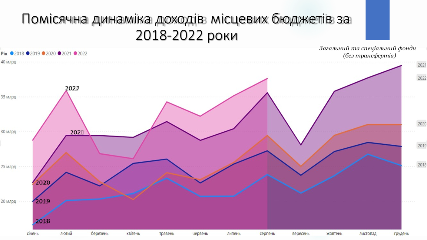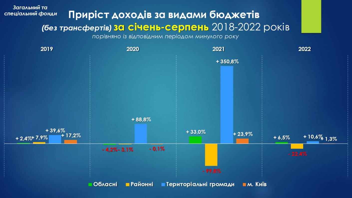 Порівняння січня-серпня 2022 року з відповідними періодами минулих років (2018-2022 роки), демонструє стійкість бюджетів територіальних громад. Обласні бюджети зазнали більших втрат від пандемії в 2020 році, ніж від повномасштабного вторгнення рф.