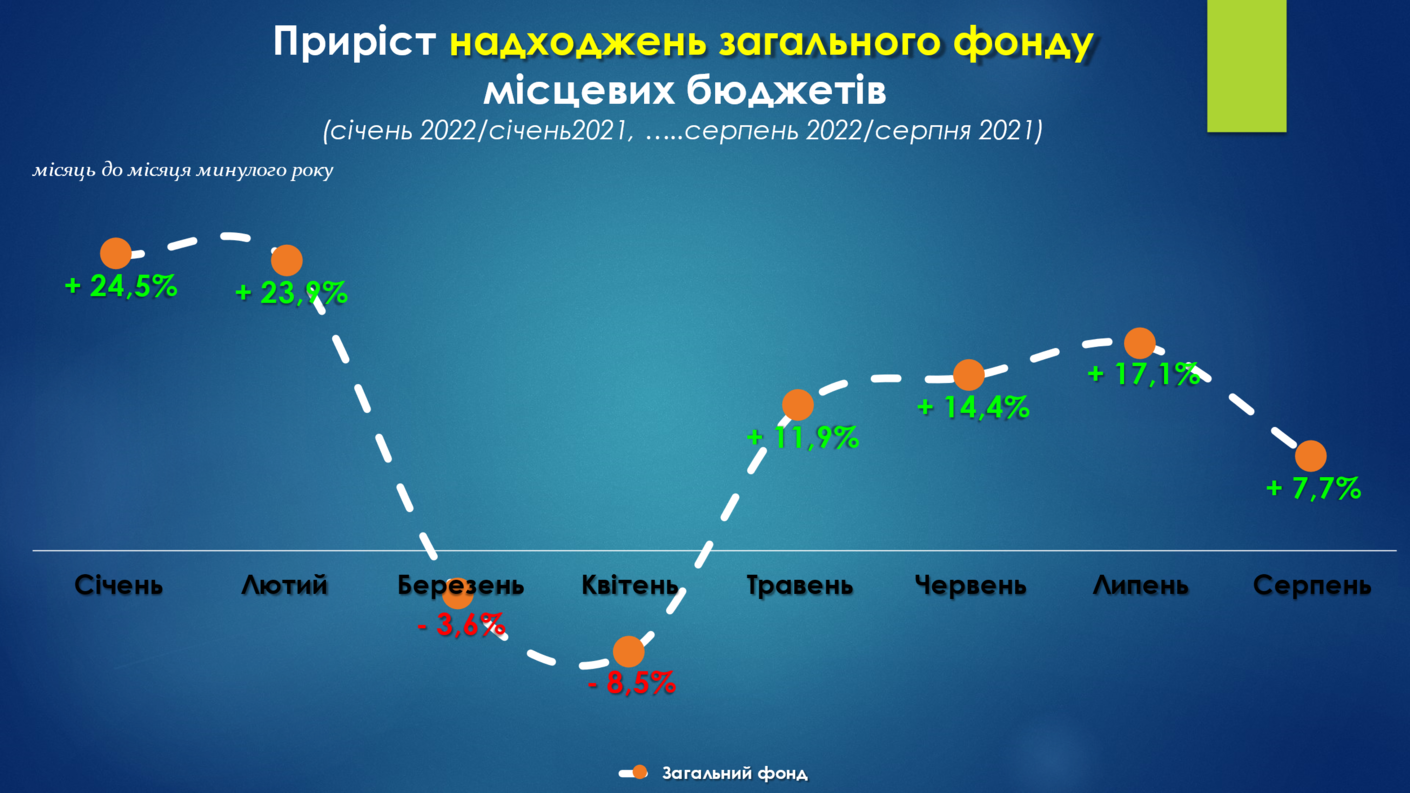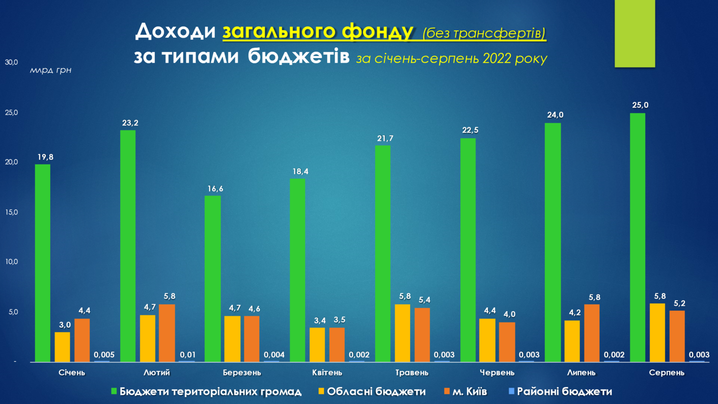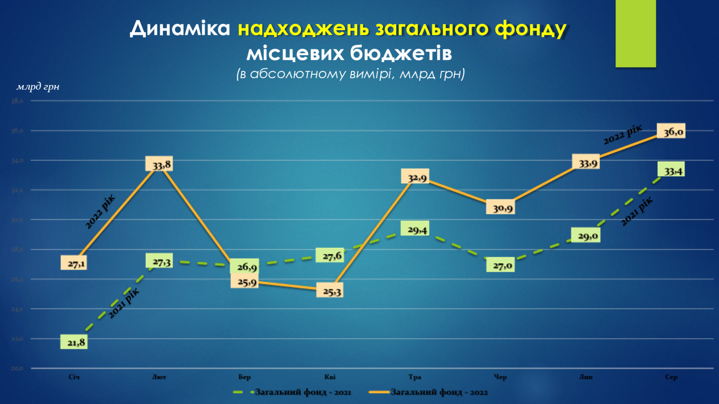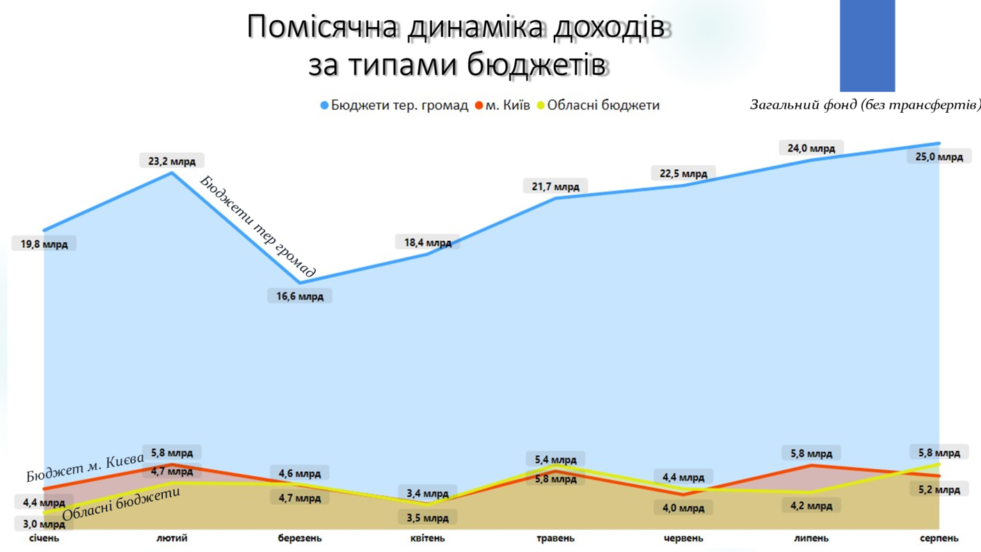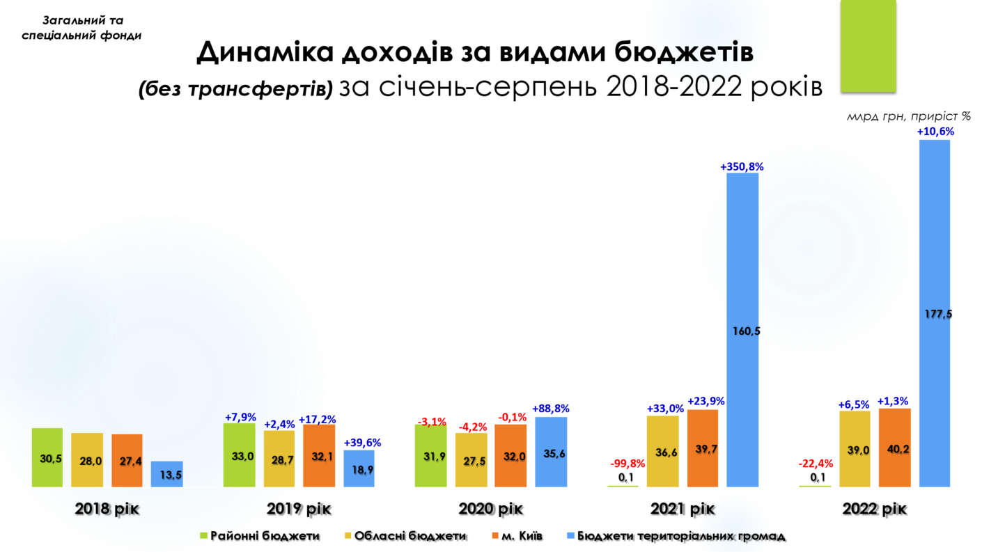 Найбільших потенційних втрат загального фонду місцеві бюджети зазнали в квітні (-2,4 млрд грн (-8,5%), порівняно із квітнем 2021 року). Але вже в травні спостерігається позитивний приріст в обсязі +3,5 млрд грн (або +11,9%), порівняно із відповідним періодом минулого року. В липні приріст доходів загального фонду місцевих бюджетів склав +4,9 млрд гривень (+17,1%). В серпні приріст склав +2,6 млрд грн (+7,7%).