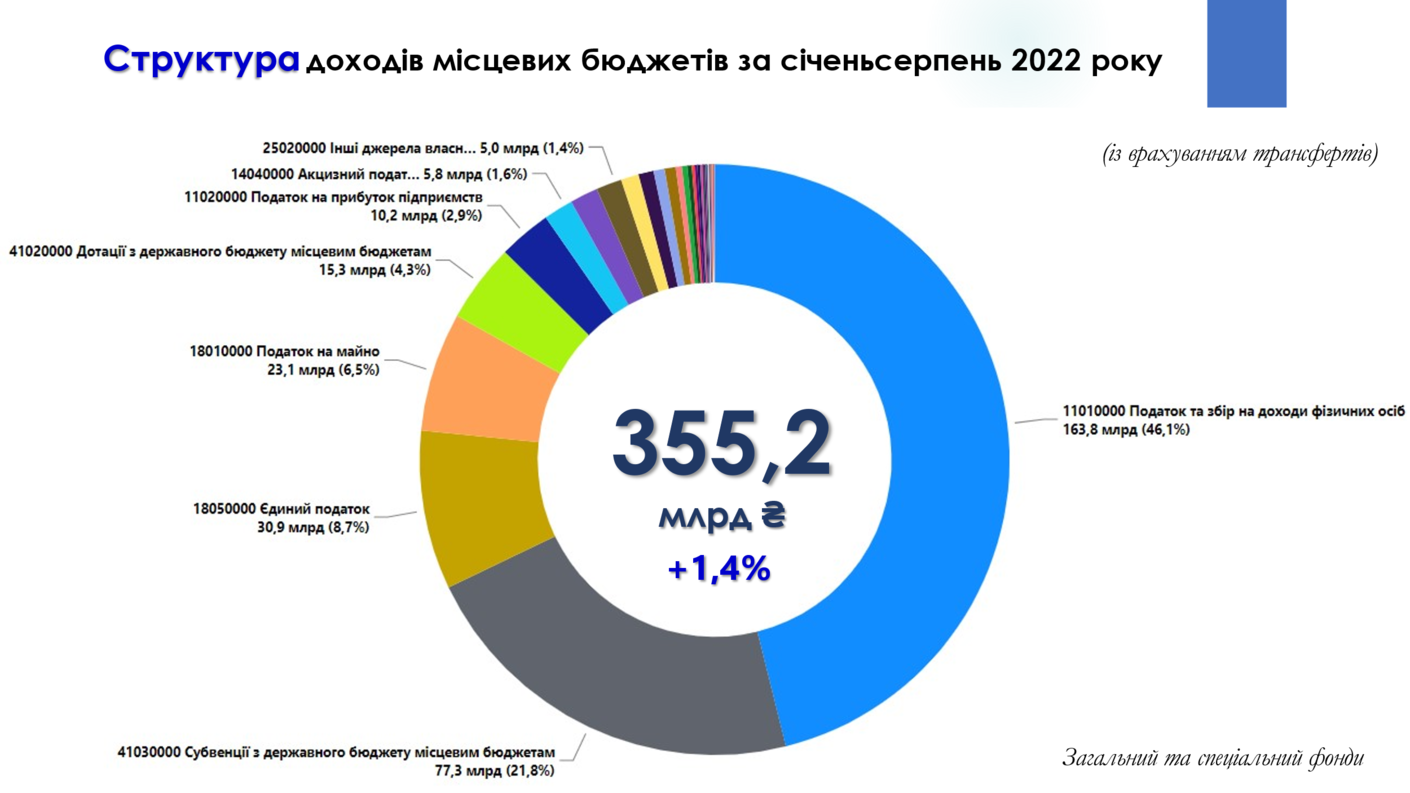 В структурі надходжень місцевих бюджетів за січень-серпень 2022 року найбільшу питому вагу займає податок з доходів фізичних осіб. В структурі доходів загального фонду без трансфертів ПДФО складає – 66,7%. В структурі загального та спеціального фондів (із трансфертами) ПДФО складає 46,1%. Наступним вагомим джерелом доходів місцевих бюджетів є субвенції з державного бюджету – 21,8% (77,3 млрд грн).