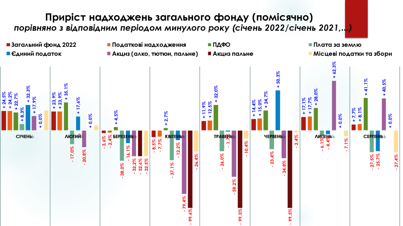 В серпні 2022 року темп росту по відношенню до серпня 2021 року дещо уповільнився. Але загалом зберігається позитивний приріст. Бізнес адаптувався та сплачує податкові платежі, в свою чергу, державна податкова служба активізувала роботу щодо стягнення податків та зборів, відновились надходження рентної плати, ПДФО стабільно зростає порівняно із 2021 роком (внаслідок значної кількості військовослужбовців із гідним грошовим забезпеченням). При цьому, внаслідок скасування загальнодержавного акцизу на пальне (встановлення ставки на рівні 0 євро за 100 літрів) місцеві бюджети, які з 1 січня 2017 року отримують певну частку (13,44%) від надходжень загальнодержавного акцизу (змінено механізм зарахування акцизу з пального через перерозподіл з державного бюджету), відчули значні втрати цього виду надходжень, що було зумовлено необхідністю врегулювання ситуації на ринку пального. Разом з цим, Президент вже підписав Закон щодо відновлення оподаткування нафтопродуктів та встановлення нових ставок на акциз із нафтопродуктів (бензин 100€/ 1000 літрів, дизель 100€/ 1000 літрів, біопаливо 100€/ 1000 літрів, газ 52 €/ 1000 літрів).