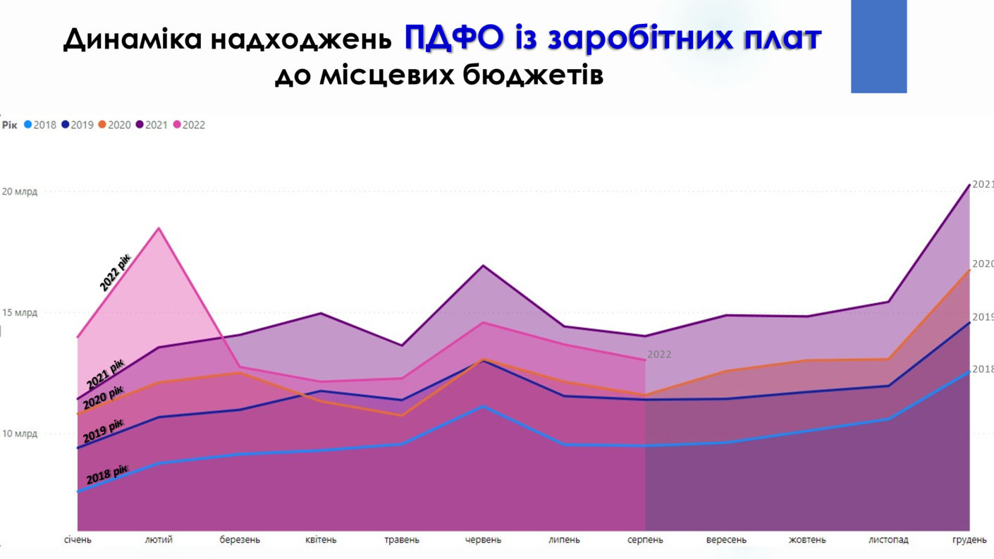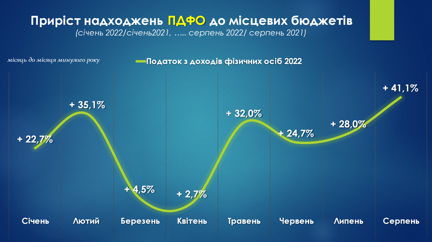 Надходження податку з доходів фізичних осіб до місцевих бюджетів протягом січня-серпня 2022 року завжди знаходились в додатному значенні. Це зумовлено, по-перше, зростанням відрахувань із заробітних плат військовослужбовців, по-друге, свою роль відіграло збільшення нормативу зарахування ПДФО до місцевих бюджетів із 60% до 64% з початку 2022 року.