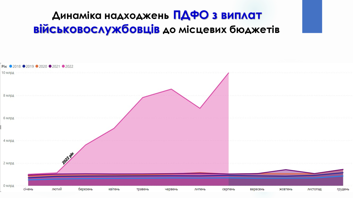 Звісно, що це зумовлено значним зростанням грошових виплат військовослужбовцям. Розглядаючи помісячну динаміку надходжень податку на доходи фізичних осіб з грошового забезпечення, грошових винагород та інших виплат, одержаних військовослужбовцями та особами рядового і начальницького складу, в розрізі 2018-2022 років, помітним з рекордне зростання таких надходжень, починаючи з березня 2022 року. Помітно, наскільки вагомим є ріст, порівняно із відповідними місяцями минулих років. А в серпні 2022 року цей показник сягнув майже 10 мільярдів гривень на місяць.