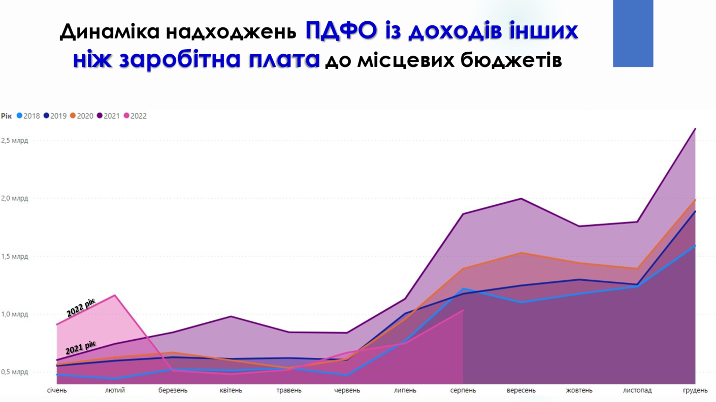Податок з доходів фізичних осіб в серпні демонструє значний приріст (+41,1% або +7,1 млрд гривень порівняно із серпнем 2021 року), що зумовлено підвищенням грошових виплат військовослужбовцям, чисельність яких значно зросла.