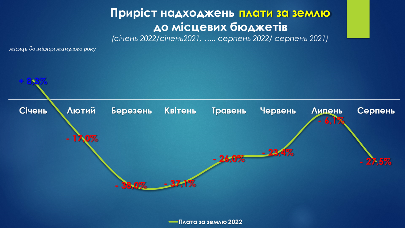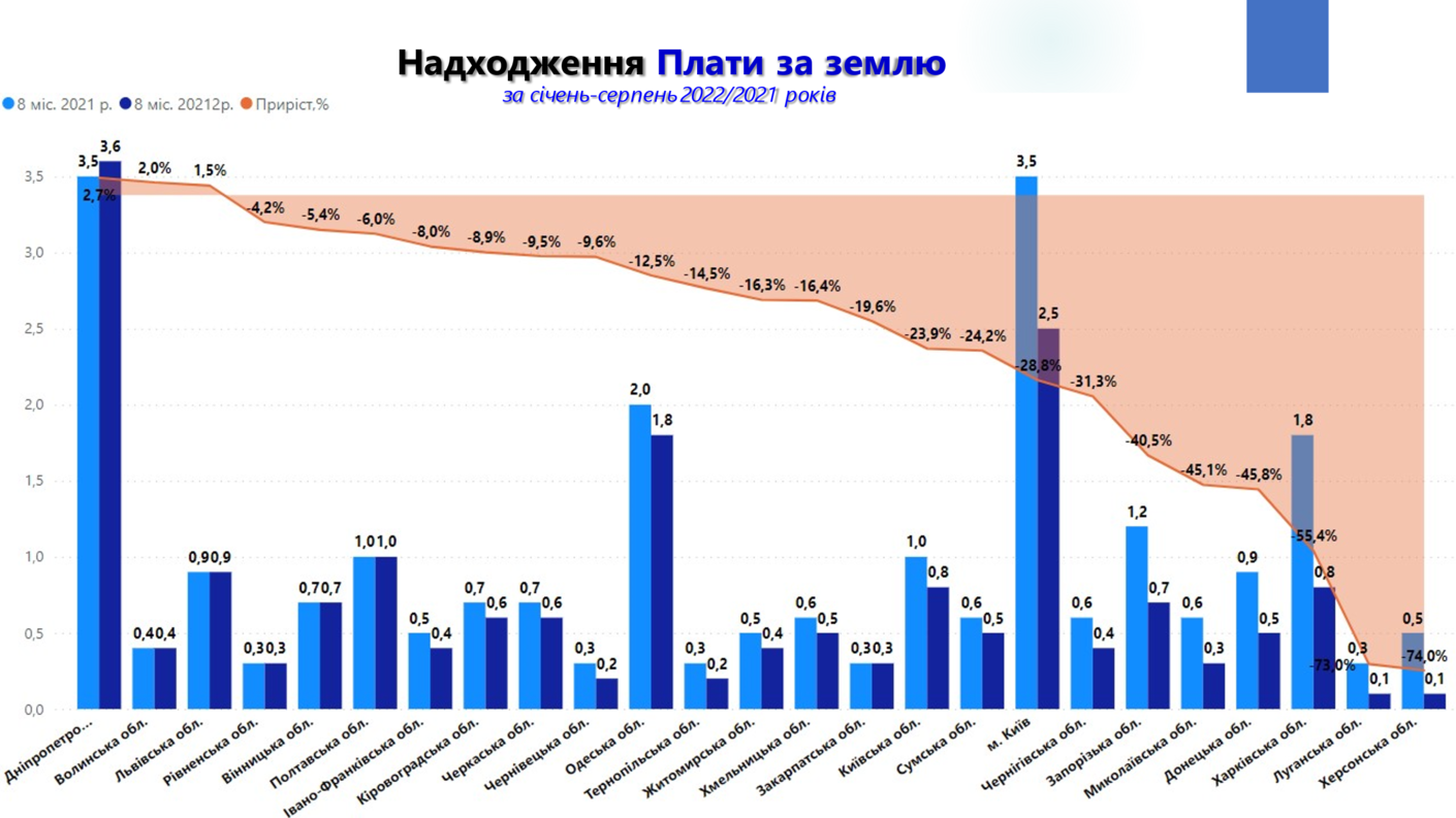 В серпні втрати місцевих бюджетів по платі за землю склали -27,5% або -1,04 млрд гривень, порівняно із відповідним місяцем минулого року. Загалом місцеві бюджети з початку року недоотримали вже більше 4 млрд гривень плати за землю.