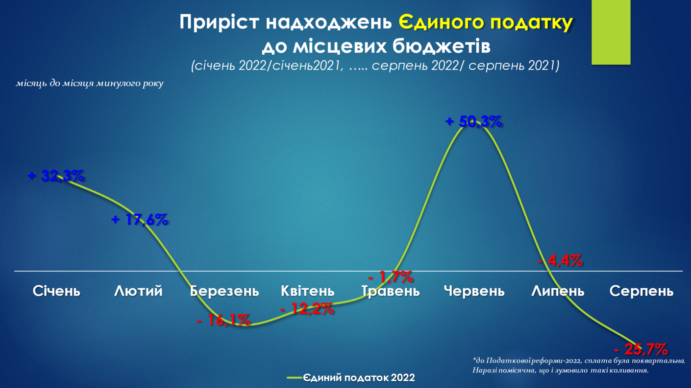 Приріст надходжень єдиного податку в червні-серпні 2022 року значно коливався (від росту +50,3% до падіння -25,7%). Цьому слугували зміни до податкового законодавства. По-перше суб’єктам господарювання із значними доходами (великий бізнес) надали право переходити на спрощену систему оподаткування: Сплата єдиного податку в розмірі 2% (знижено із 5% до 2%) замість сплати податку на прибуток (18%). (Закон України №2142-IX від 24.03.2022, законопроект 7190 від 22.03.2022). Як наслідок, чимало суб’єктів господарювання обрали спрощену систему оподаткування та сплату Єдиного податку замість Податку на прибуток, що, в свою чергу, забезпечило приріст даного виду надходжень. При цьому, змінились терміни сплати зазначеного податку. Так, раніше сплата проводилась поквартально (протягом 50 днів після закінчення звітного кварталу), наразі сплата Єдиного податку за новим принципом відбувається помісячно (протягом 30 днів після закінчення звітного місяця).