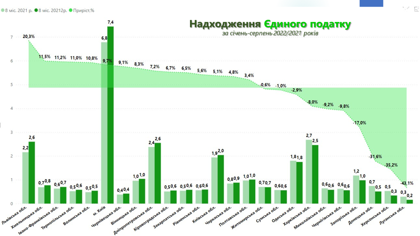 В розрізі регіонів, сплата єдиного податку суттєво відрізняється від +20,3% приросту в Львівській області до значного зниження таких надходжень в Сумській, Харківській,  Миколаївській, Чернігівській, Запорізькій, Донецькій, Херсонській та Луганській областях. Помітно, що це саме ті області, де велися (ведуться) бойові дії, внаслідок чого малий та середній бізнеси були релоковані, або ж зовсім припинені в даних регіонах.
