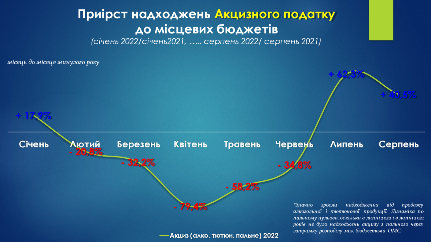 Разом з цим, додатні прирости акцизу з тютюну і алкоголю, а також враховуючи, що перерахування акцизу із пального йде із значною затримкою (через зміну механізму зарахування починаючи із 1 січня 2017 року) (тобто нульові надходження в липні 2021 року і в липні 2022 року) забезпечили додатний приріст акцизного податку до місцевих бюджетів.