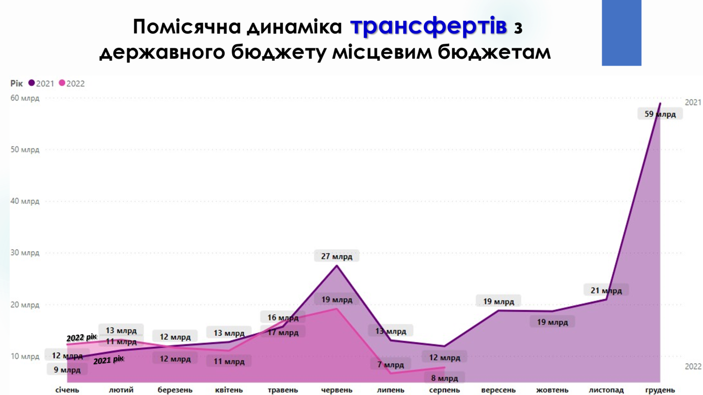 З початку 2022 року (станом на 01.09.2022) Уряд перерахував місцевим бюджетам 92,7 млрд гривень міжбюджетних трансфертів, що складає 83% від передбачених розписом асигнувань, зокрема: