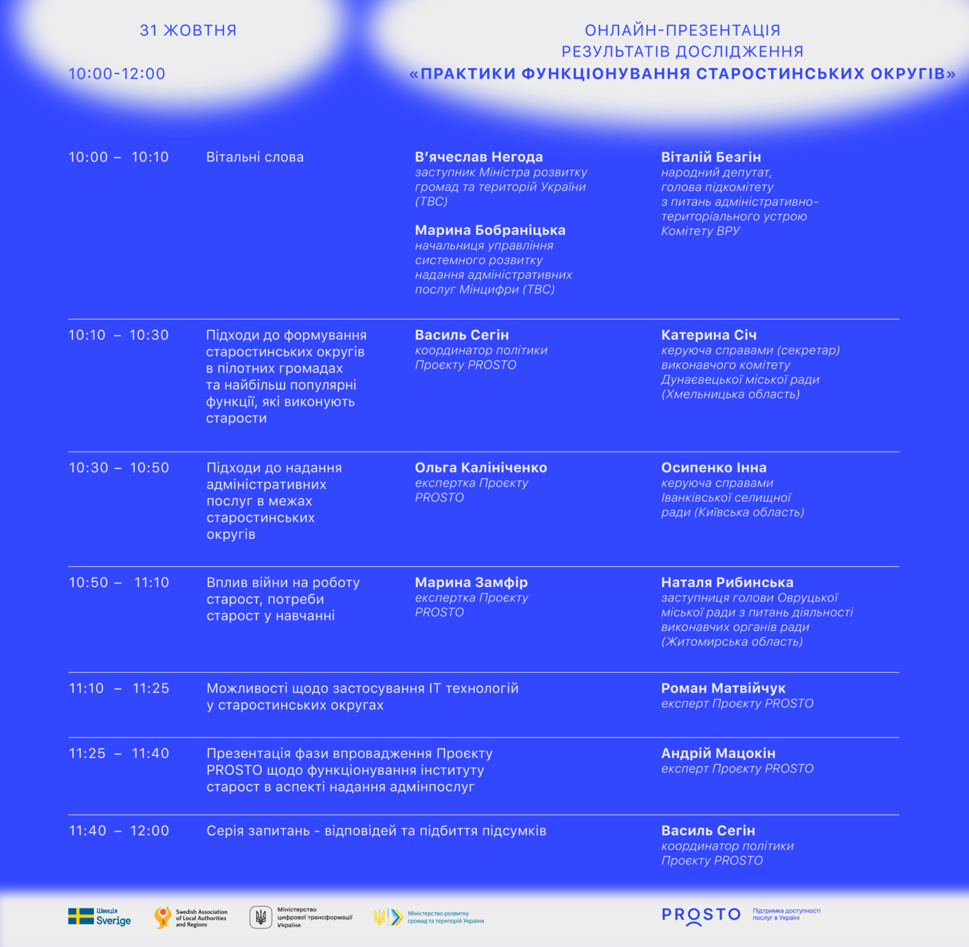 31 жовтня шведсько-український проєкт PROSTO «Підтримка доступності послуг в Україні» презентує результати дослідження «Практики функціонування старостинських округів».