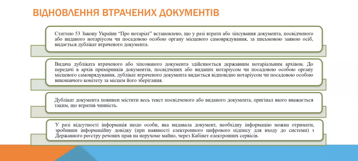 Ольга Савченко розʼяснює, що дублікати правовстановлюючих документів можна отримати шляхом звернення до відповідного органу, який видав документ. Зазвичай це ОМС, нотаріуси, державний реєстратор, Держгеокадастр. Якщо локальні органи влади не надають документи з певних причин, можна звернутися до суду про встановлення юридичного факту про визнання права власності на обʼєкт нерухомого майна.