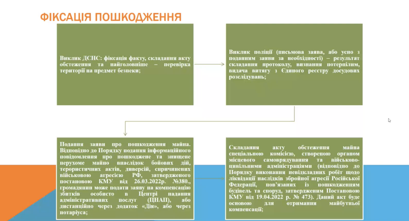 Процес відшкодування завданих збитків регламентується Постановою Кабінету міністрів України від 26.03.022 № 380. Постанова описує алгоритм фіксації пошкоджень, проте не до кінця детально. Також на розгляді Верховної Ради України лежить законопроект “Про державну реєстрацію збитків, завданих внаслідок збройної агресії Російської Федерації проти України”. Але це поки лише проект, тому експерти рекомендують послуговуватися на даному етапі Постановою.