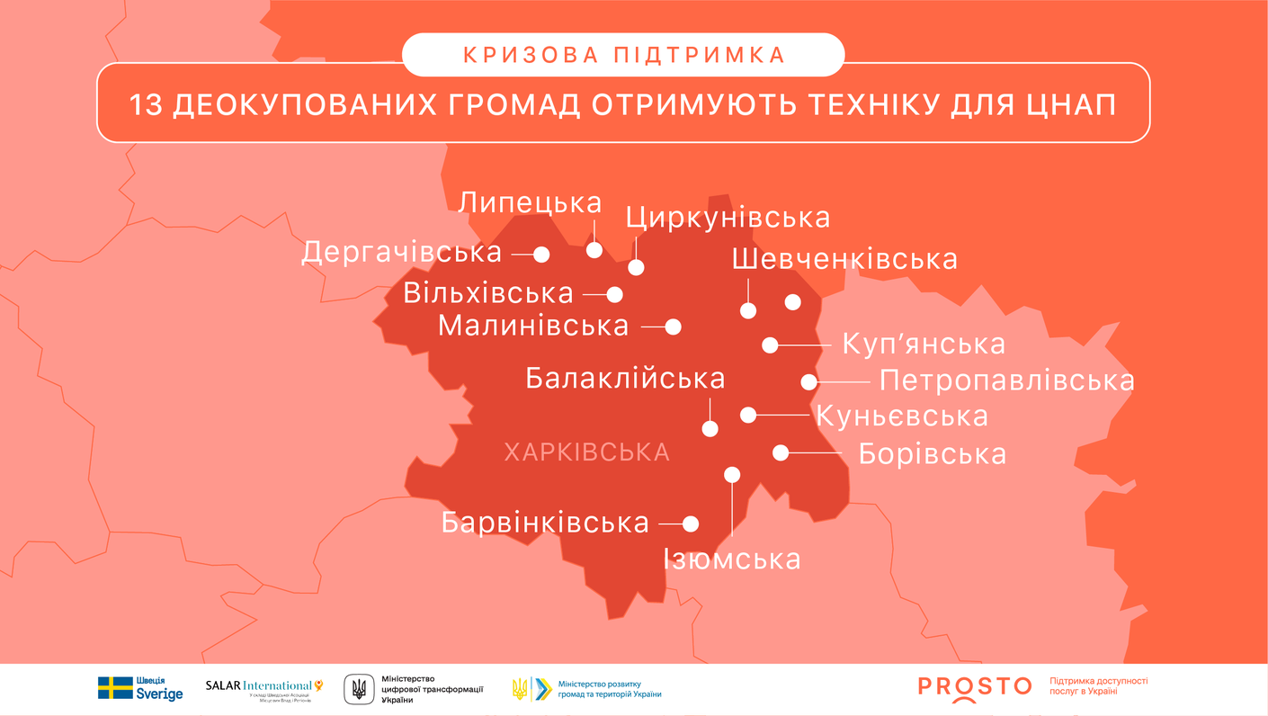 Перелік громад для отримання кризової допомоги визначений за результатами моніторингу і комунікації з громадами та зкоординовано з Міністерством цифрової трансформації під час спільної зустрічі представників Харківської війської обласної адміністрації, органів місцевого самоврядування Харківської області, експертів Проєкту та Мінцифри.