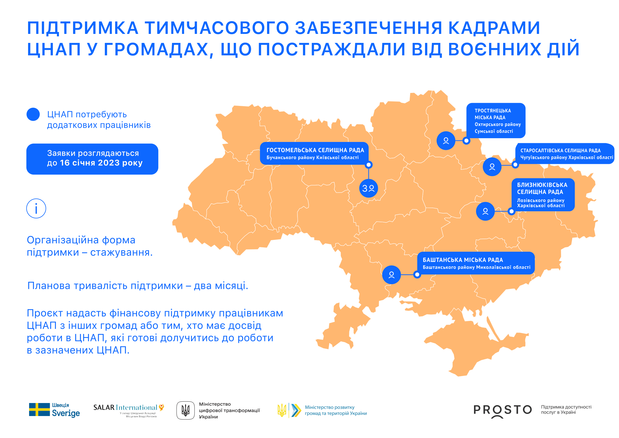 Після відсунення лінії фронту громади стикаються із новими викликами і мають чимало завдань для відновлення надання послуг мешканцям. Зокрема, один з викликів – нестача спеціалістів для надання адміністративних послуг у ЦНАП. У партнерстві з Мінцифри шведсько-український Проєкт PROSTO прагне підтримати такі громади та поєднати фахівців з постраждалими ЦНАП, які потребують працівників.